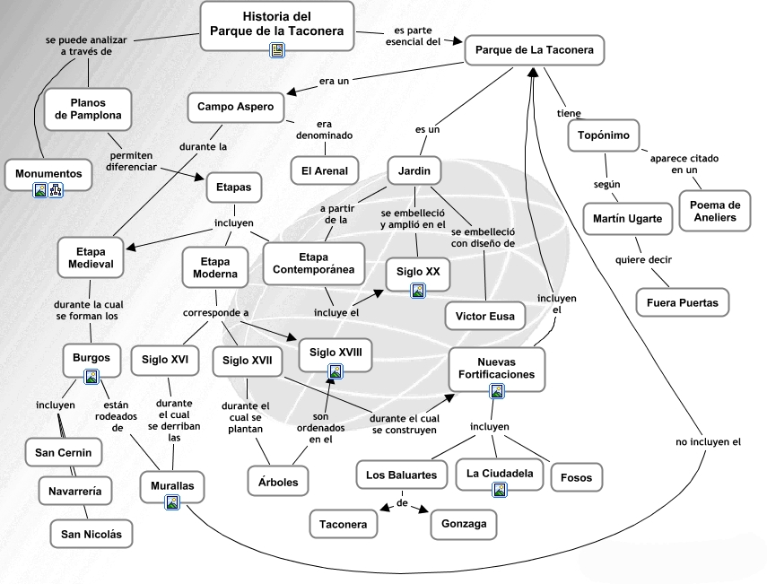 This Concept Map, created with IHMC CmapTools, has information related to: Historia del Parque de la Taconera, Nuevas Fortificaciones incluyen Fosos, Jardin se embelleció con diseño de Victor Eusa, Siglo XVII durante el cual se plantan Árboles, Etapa Moderna corresponde a Siglo XVII, Murallas no incluyen el Parque de La Taconera, Nuevas Fortificaciones incluyen La Ciudadela, Etapa Moderna corresponde a Siglo XVI, Burgos incluyen San Nicolás, Burgos están rodeados de Murallas, Los Baluartes de Taconera, Nuevas Fortificaciones incluyen el Parque de La Taconera, Etapa Moderna corresponde a Siglo XVIII, Etapas incluyen Etapa Moderna, Campo Aspero era denominado El Arenal, Jardin se embelleció y amplió en el Siglo XX, Los Baluartes de Gonzaga, Burgos incluyen Navarrería, Parque de La Taconera es un Jardin, Planos de Pamplona permiten diferenciar Etapas, Historia del Parque de la Taconera es parte esencial del Parque de La Taconera