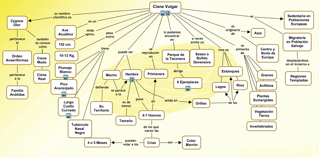 This Concept Map, created with IHMC CmapTools, has information related to: Cisne Vulgar, Cisne Vulgar mide aprox. 152 cm., Cisne Vulgar vive en Rios, Cisne Vulgar puede ser Macho, 4-7 Huevos en Primavera, Cisne Vulgar vive en Estanques, Cisne Vulgar lo podemos encontrar en Parque de la Taconera, Cisne Vulgar se alimenta de Granos, Cygnus Olor también se conoce como Cisne Real, Hembra es de menor Tamaño, Crías pueden volar a los 4 o 5 Meses, Cisne Vulgar puede ser Hembra, Cisne Vulgar vive en Lagos, 4-7 Huevos de los que nacen las Crías, Crías son Color Marrón, Cisne Vulgar tiene Tubérculo Nasal Negro, Macho se parece a la Hembra, Orillas de los Rios, Cisne Vulgar se alimenta de Vegetación Tierna, Cisne Vulgar tiene Largo Cuello Curvado, Órden Anseriformes pertenece a la Familia Anátidas