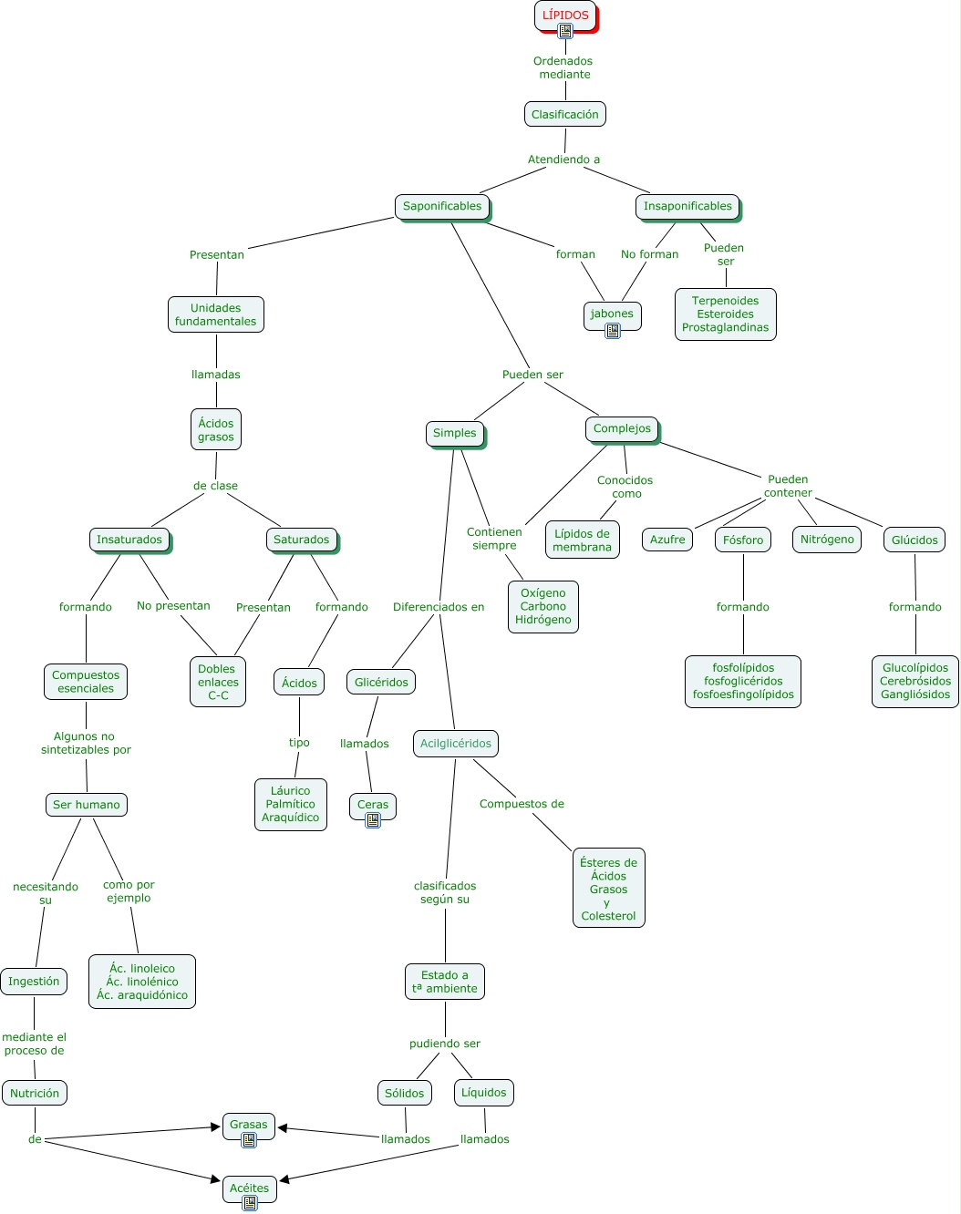Este Cmap, tiene información relacionada con: Clasificación lipidos, Glúcidos formando Glucolípidos Cerebrósidos Gangliósidos, Saponificables Pueden ser Complejos, Ácidos tipo Láurico Palmítico Araquídico, Saponificables Presentan Unidades fundamentales, Saponificables Pueden ser Simples, Complejos Pueden contener Azufre, Unidades fundamentales llamadas Ácidos grasos, Simples Diferenciados en Glicéridos, Ser humano necesitando su Ingestión, Estado a tª ambiente pudiendo ser Sólidos, Complejos Pueden contener Nitrógeno, Acilglicéridos Compuestos de Ésteres de Ácidos Grasos y Colesterol, Compuestos esenciales Algunos no sintetizables por Ser humano, Insaponificables No forman jabones, Ácidos grasos de clase Saturados, Insaponificables Pueden ser Terpenoides Esteroides Prostaglandinas, Líquidos llamados Acéites, Insaturados No presentan Dobles enlaces C-C, Sólidos llamados Grasas, Saponificables forman jabones
