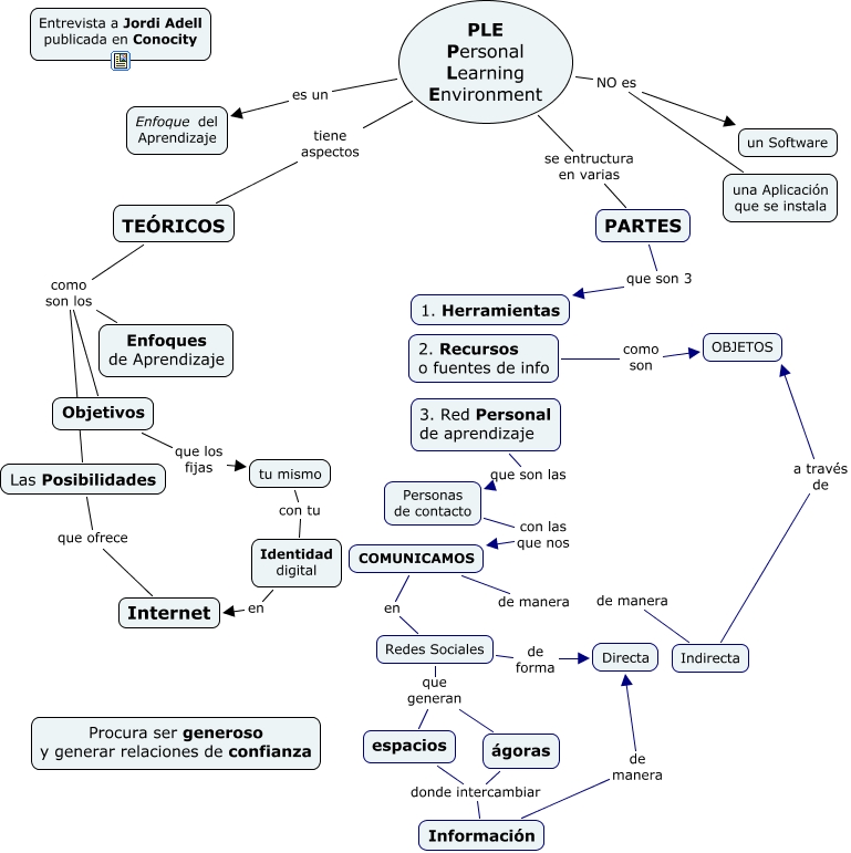 Este Cmap, tiene información relacionada con: PLE_Pers_Learn_Environ_Jordi, espacios donde intercambiar Información, PLE Personal Learning Environment tiene aspectos TEÓRICOS, Redes Sociales de forma Directa, PLE Personal Learning Environment se entructura en varias PARTES, Personas de contacto con las que nos COMUNICAMOS, TEÓRICOS como son los Las Posibilidades, TEÓRICOS como son los Objetivos, Objetivos que los fijas tu mismo, Información de manera Directa, COMUNICAMOS de manera Directa, Las Posibilidades que ofrece Internet, TEÓRICOS como son los Enfoques de Aprendizaje, Identidad digital en Internet, ágoras donde intercambiar Información, COMUNICAMOS de manera Indirecta, PLE Personal Learning Environment NO es una Aplicación que se instala, Redes Sociales que generan ágoras, COMUNICAMOS en Redes Sociales, 3. Red Personal de aprendizaje que son las Personas de contacto, tu mismo con tu Identidad digital
