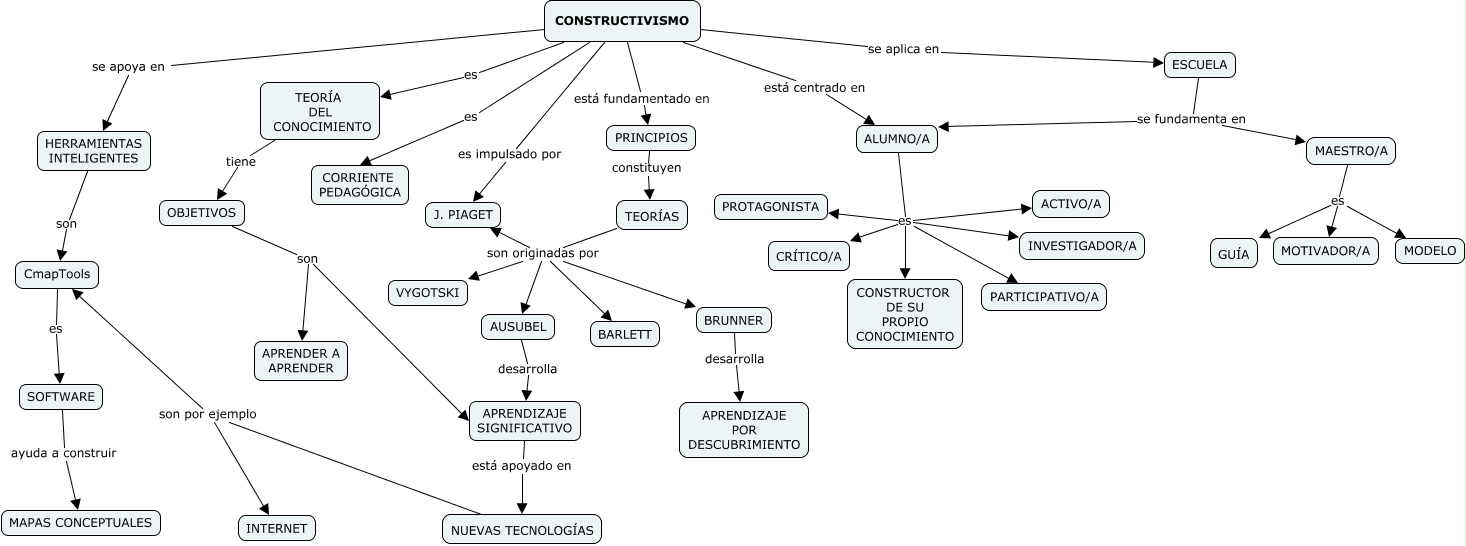Este Cmap, tiene información relacionada con: Constructivismo, NUEVAS TECNOLOGÍAS son por ejemplo CmapTools, OBJETIVOS son APRENDIZAJE SIGNIFICATIVO, APRENDIZAJE SIGNIFICATIVO está apoyado en NUEVAS TECNOLOGÍAS, AUSUBEL desarrolla APRENDIZAJE SIGNIFICATIVO, CONSTRUCTIVISMO se apoya en HERRAMIENTAS INTELIGENTES, SOFTWARE ayuda a construir MAPAS CONCEPTUALES, PRINCIPIOS constituyen TEORÍAS, CONSTRUCTIVISMO está fundamentado en PRINCIPIOS, ALUMNO/A es CONSTRUCTOR DE SU PROPIO CONOCIMIENTO, MAESTRO/A es GUÍA, ESCUELA se fundamenta en MAESTRO/A, ALUMNO/A es ACTIVO/A, ALUMNO/A es INVESTIGADOR/A, CONSTRUCTIVISMO es impulsado por J. PIAGET, TEORÍAS son originadas por J. PIAGET, TEORÍAS son originadas por VYGOTSKI, TEORÍAS son originadas por AUSUBEL, TEORÍA DEL CONOCIMIENTO tiene OBJETIVOS, NUEVAS TECNOLOGÍAS son por ejemplo INTERNET, ALUMNO/A es PARTICIPATIVO/A