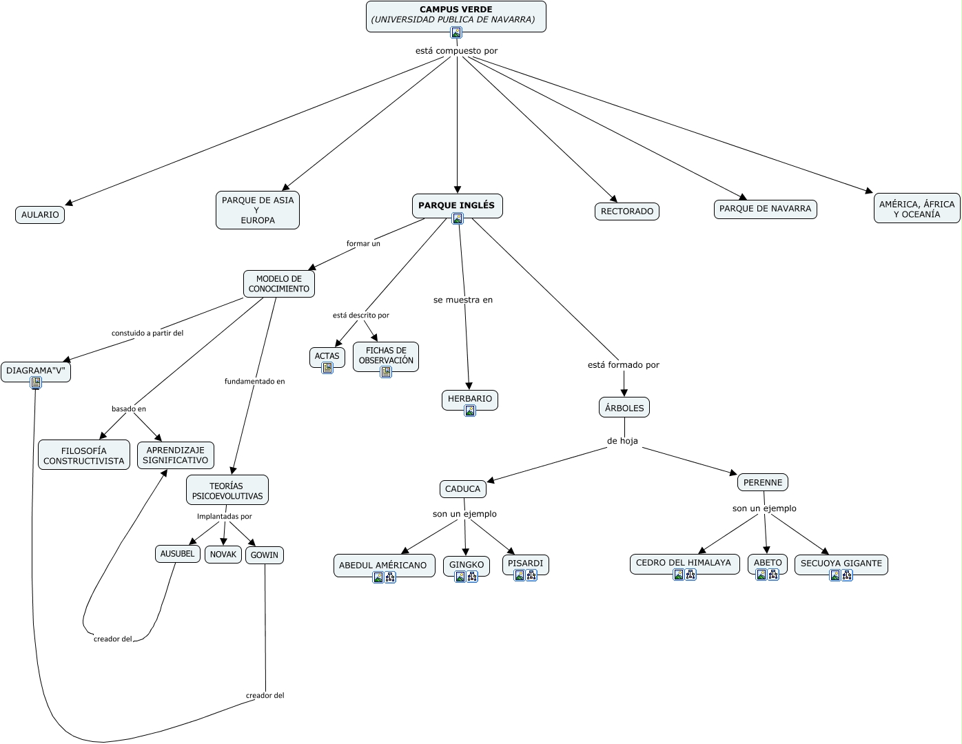 Este Cmap, tiene información relacionada con: campus verde, CADUCA son un ejemplo GINGKO, MODELO DE CONOCIMIENTO basado en APRENDIZAJE SIGNIFICATIVO, ÁRBOLES de hoja CADUCA, TEORÍAS PSICOEVOLUTIVAS Implantadas por AUSUBEL, PARQUE INGLÉS se muestra en HERBARIO, ÁRBOLES de hoja PERENNE, CAMPUS VERDE (UNIVERSIDAD PUBLICA DE NAVARRA) está compuesto por AULARIO, PARQUE INGLÉS está descrito por ACTAS, CADUCA son un ejemplo PISARDI, MODELO DE CONOCIMIENTO basado en FILOSOFÍA CONSTRUCTIVISTA, PERENNE son un ejemplo ABETO, PERENNE son un ejemplo SECUOYA GIGANTE, PERENNE son un ejemplo CEDRO DEL HIMALAYA, MODELO DE CONOCIMIENTO fundamentado en TEORÍAS PSICOEVOLUTIVAS, CAMPUS VERDE (UNIVERSIDAD PUBLICA DE NAVARRA) está compuesto por RECTORADO, PARQUE INGLÉS está formado por ÁRBOLES, CAMPUS VERDE (UNIVERSIDAD PUBLICA DE NAVARRA) está compuesto por AMÉRICA, ÁFRICA Y OCEANÍA, CAMPUS VERDE (UNIVERSIDAD PUBLICA DE NAVARRA) está compuesto por PARQUE DE ASIA Y EUROPA, TEORÍAS PSICOEVOLUTIVAS Implantadas por NOVAK, TEORÍAS PSICOEVOLUTIVAS Implantadas por GOWIN