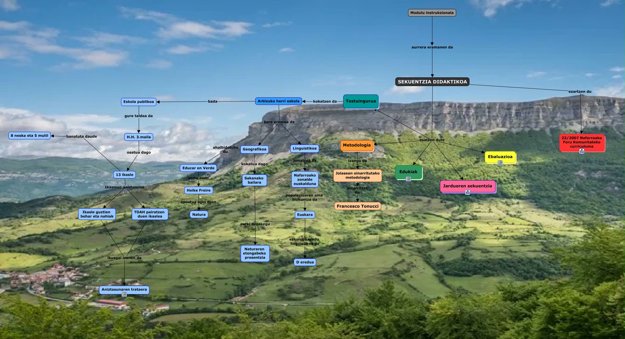 Este Cmap, tiene información relacionada con: (Modulu Instrukzionala) Sekuentzia Didaktikoa, Linguistikoa zonaldea da Nafarroako zonalde euskalduna, Geografikoa kokatua dago Sakanako bailara, Modulu instrukzionala aurrera eramanen da SEKUENTZIA DIDAKTIKOA, SEKUENTZIA DIDAKTIKOA ezartzen du 23/2007 Nafarroako Foru Komunitateko curriculuma, Arbizuko herri eskola bada Eskola publikoa, H.H. 3.maila osatua dago 13 ikasle, SEKUENTZIA DIDAKTIKOA osatzen dute Edukiak, Eskola publikoa gure taldea da H.H. 3.maila, Arbizuko herri eskola bere eremua da Linguistikoa, SEKUENTZIA DIDAKTIKOA osatzen dute Testuingurua, Metodologia izango da Jolasean oinarritutako metodologia, SEKUENTZIA DIDAKTIKOA osatzen dute Jardueren sekuentzia, TDAH pairatzen duen ikaslea ikusgai izanen da Aniztasunaren trataera, Jolasean oinarritutako metodologia oinarritzat du Francesco Tonucci, Nafarroako zonalde euskalduna populazioaren ama hizkuntza da Euskara, SEKUENTZIA DIDAKTIKOA osatzen dute Ebaluazioa, Testuingurua kokatzen da Arbizuko herri eskola, 13 ikasle Ikasleen aniztasuna TDAH pairatzen duen ikaslea, Euskara eskolako eredu linguistikoa da D eredua, Heike Freire apostua egin zuen Natura