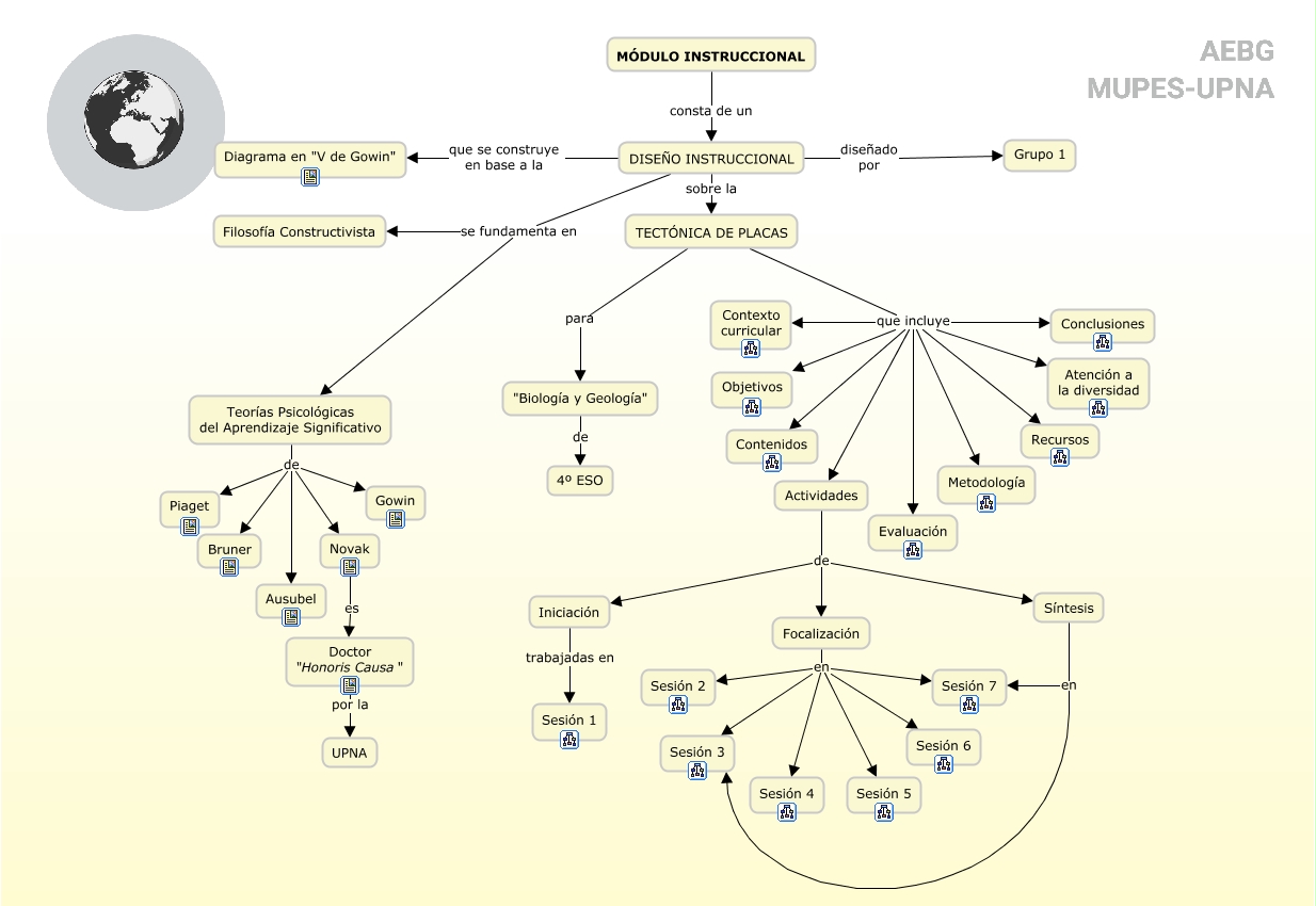 Este Cmap, tiene información relacionada con: G1_MODULO INSTRUCCIONAL_MUPES, Focalización en Sesión 6, TECTÓNICA DE PLACAS que incluye Contenidos, Focalización en Sesión 3, Actividades de Focalización, DISEÑO INSTRUCCIONAL sobre la TECTÓNICA DE PLACAS, DISEÑO INSTRUCCIONAL diseñado por Grupo 1, Iniciación trabajadas en Sesión 1, Síntesis en Sesión 3, Novak es Doctor "Honoris Causa", Teorías Psicológicas del Aprendizaje Significativo de Gowin, Teorías Psicológicas del Aprendizaje Significativo de Novak, TECTÓNICA DE PLACAS que incluye Evaluación, TECTÓNICA DE PLACAS que incluye Objetivos, TECTÓNICA DE PLACAS que incluye Metodología, Síntesis en Sesión 7, Doctor "Honoris Causa" por la UPNA, Focalización en Sesión 4, TECTÓNICA DE PLACAS que incluye Conclusiones, Teorías Psicológicas del Aprendizaje Significativo de Piaget, Teorías Psicológicas del Aprendizaje Significativo de Ausubel