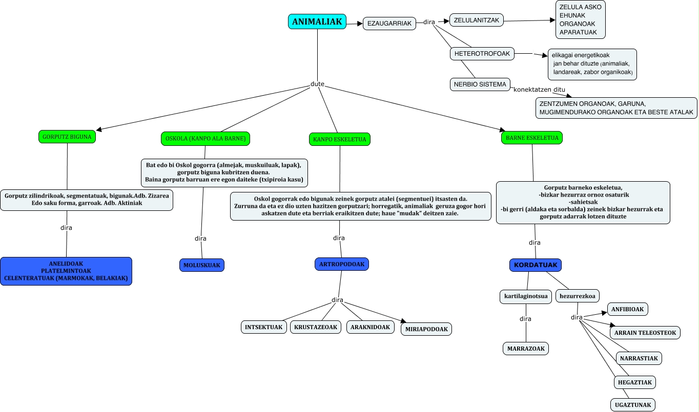 Este Cmap, tiene información relacionada con: animaliak, KANPO ESKELETUA dira ARTROPODOAK, kartilaginotsua dira MARRAZOAK, BARNE ESKELETUA dira KORDATUAK, hezurrezkoa dira HEGAZTIAK, EZAUGARRIAK dira HETEROTROFOAK, ANIMALIAK dute KANPO ESKELETUA, hezurrezkoa dira UGAZTUNAK, ANIMALIAK ???? EZAUGARRIAK, GORPUTZ BIGUNA dira ANELIDOAK PLATELMINTOAK CELENTERATUAK (MARMOKAK, BELAKIAK), OSKOLA (KANPO ALA BARNE) dira MOLUSKUAK, ANIMALIAK dute OSKOLA (KANPO ALA BARNE), ARTROPODOAK dira MIRIAPODOAK, ARTROPODOAK dira ARAKNIDOAK, NERBIO SISTEMA konektatzen ditu ZENTZUMEN ORGANOAK, GARUNA, MUGIMENDURAKO ORGANOAK ETA BESTE ATALAK, KORDATUAK ???? hezurrezkoa, ZELULANITZAK ???? ZELULA ASKO EHUNAK ORGANOAK APARATUAK, HETEROTROFOAK elikagai energetikoak jan behar dituzte (animaliak, landareak, zabor organikoak), hezurrezkoa dira ARRAIN TELEOSTEOK, ARTROPODOAK dira KRUSTAZEOAK, EZAUGARRIAK dira NERBIO SISTEMA