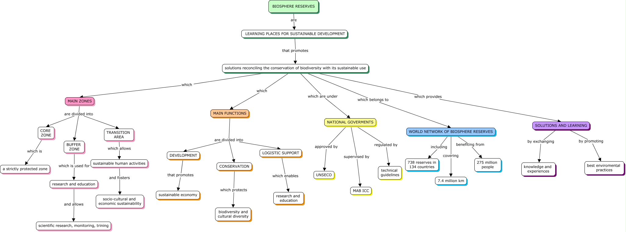 Este Cmap, tiene información relacionada con: BIOSPHERE RESERVES CMAP - G4, sustainable human activities and fosters socio-cultural and economic sustainability, WORLD NETWORK OF BIOSPHERE RESERVES covering 7.4 million km, NATIONAL GOVERMENTS approved by UNSECO, BIOSPHERE RESERVES are LEARNING PLACES FOR SUSTAINABLE DEVELOPMENT, NATIONAL GOVERMENTS regulated by technical guidelines, MAIN ZONES are divided into BUFFER ZONE, DEVELOPMENT that promotes sustainable economy, MAIN ZONES are divided into TRANSITION AREA, NATIONAL GOVERMENTS supervised by MAB ICC, TRANSITION AREA which allows sustainable human activities, solutions reconciling the conservation of biodiversity with its sustainable use which are under NATIONAL GOVERMENTS, CORE ZONE which is a strictly protected zone, MAIN FUNCTIONS are divided into LOGISTIC SUPPORT, solutions reconciling the conservation of biodiversity with its sustainable use which MAIN ZONES, LEARNING PLACES FOR SUSTAINABLE DEVELOPMENT that promotes solutions reconciling the conservation of biodiversity with its sustainable use, LOGISTIC SUPPORT which enables research and education, MAIN FUNCTIONS are divided into CONSERVATION, solutions reconciling the conservation of biodiversity with its sustainable use which provides SOLUTIONS AND LEARNING, research and education and allows scientific research, monitoring, trining, SOLUTIONS AND LEARNING by promoting best enviromental practices