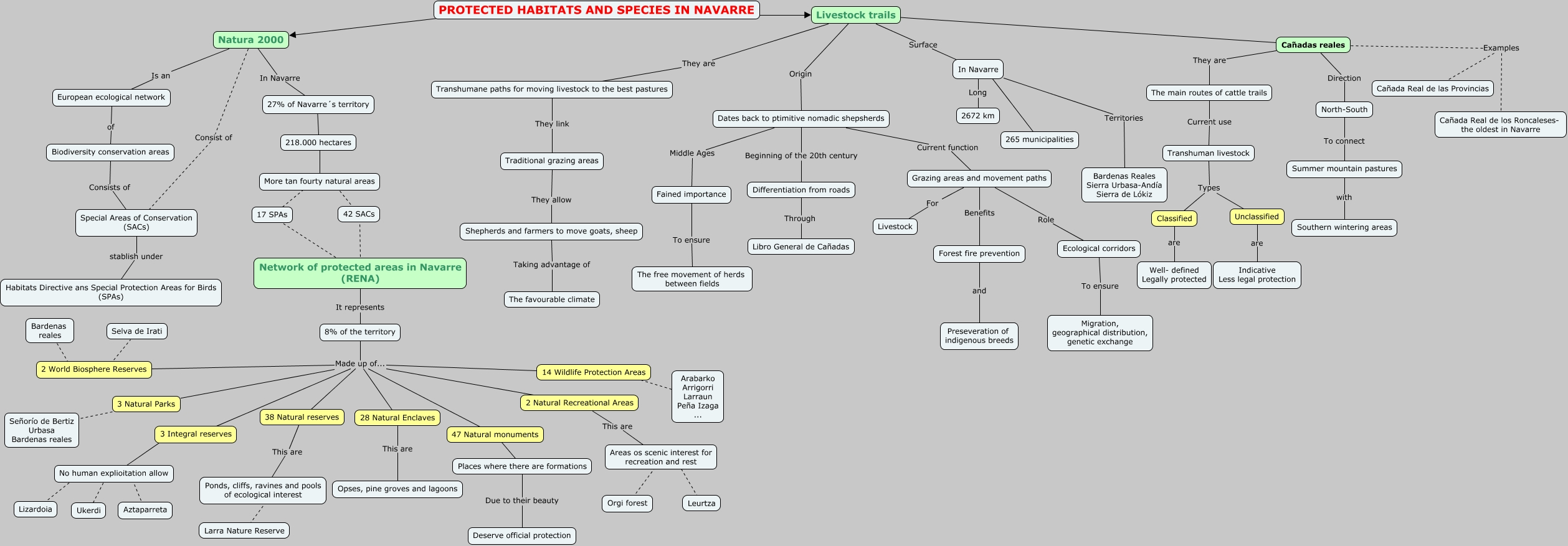 Este Cmap, tiene información relacionada con: Cmap1, Summer mountain pastures with Southern wintering areas, 27% of Navarre´s territory ???? 218.000 hectares, Areas os scenic interest for recreation and rest ???? Leurtza, 2 Natural Recreational Areas Made up of... 47 Natural monuments, Transhumane paths for moving livestock to the best pastures They link Traditional grazing areas, No human explioitation allow ???? Ukerdi, 14 Wildlife Protection Areas Made up of... 47 Natural monuments, Grazing areas and movement paths Role Ecological corridors, 14 Wildlife Protection Areas Made up of... 28 Natural Enclaves, Natura 2000 Is an European ecological network, Forest fire prevention and Preseveration of indigenous breeds, 8% of the territory Made up of... 28 Natural Enclaves, 3 Natural Parks Made up of... 28 Natural Enclaves, 47 Natural monuments ???? Places where there are formations, 3 Natural Parks Made up of... 47 Natural monuments, Places where there are formations Due to their beauty Deserve official protection, 2 Natural Recreational Areas Made up of... 28 Natural Enclaves, Transhuman livestock Types Unclassified, 218.000 hectares ???? More tan fourty natural areas, 2 World Biosphere Reserves Made up of... 47 Natural monuments