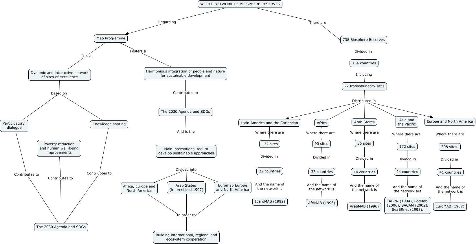 Este Cmap, tiene información relacionada con: Biosphere Reserves, Arab States (in preetized 1907) In order to Building international, regional and ecosystem cooperation, Participatory dialogue Contributes to The 2030 Agenda and SDGs, Dynamic and interactive network of sites of excellence Based on Participatory dialogue, Asia and the Pacific Where there are 172 sites, 22 fransobundary sites Distributed in Europe and North America, Europe and North America Where there are 308 sites, 90 sites Divided in 33 countries, Harmonious integration of people and nature for sustainable development Contributes to The 2030 Agenda and SDGs, 33 countries And the name of the network is AfriMAB (1996), Dynamic and interactive network of sites of excellence Based on Poverty reduction and human well-being improvements, 36 sites Divided in 14 countries, Africa, Europe and North America In order to Building international, regional and ecosystem cooperation, Mab Programme It is a Dynamic and interactive network of sites of excellence, WORLD NETWORK OF BIOSPHERE RESERVES There are 738 Biosphere Reserves, Knowledge sharing Contriubtes to The 2030 Agenda and SDGs, Latin America and the Caribbean Where there are 132 sites, Main international tool to develop sustainable approaches Divided into Euromap Europe and North America, 172 sites Divided in 24 countries, 22 fransobundary sites Distributed in Africa, 132 sites Divided in 22 countries