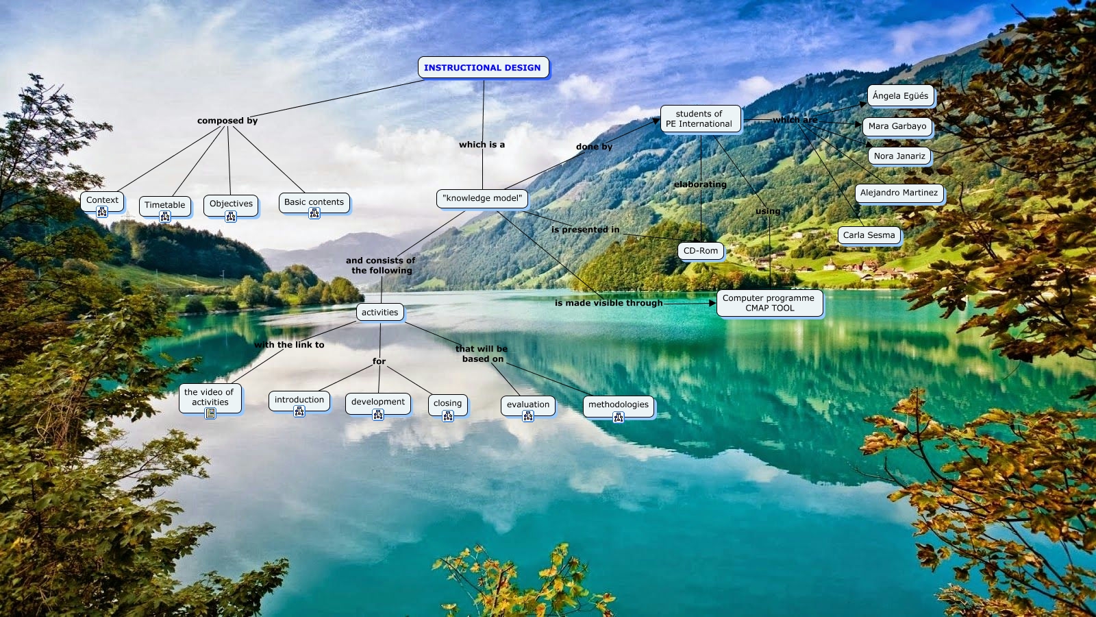 Este Cmap, tiene información relacionada con: Instructional Design, students of PE International which are Carla Sesma, activities that will be based on methodologies, INSTRUCTIONAL DESIGN composed by Objectives, students of PE International which are Alejandro Martinez, students of PE International which are Mara Garbayo, INSTRUCTIONAL DESIGN which is a "knowledge model", students of PE International using Computer programme CMAP TOOL, activities for introduction, "knowledge model" done by students of PE International, activities for closing, "knowledge model" and consists of the following activities, INSTRUCTIONAL DESIGN composed by Timetable, INSTRUCTIONAL DESIGN composed by Basic contents, "knowledge model" is presented in CD-Rom, students of PE International which are Ángela Egüés, "knowledge model" is made visible through Computer programme CMAP TOOL, INSTRUCTIONAL DESIGN composed by Context, activities with the link to the video of activities, students of PE International elaborating CD-Rom, students of PE International which are Nora Janariz