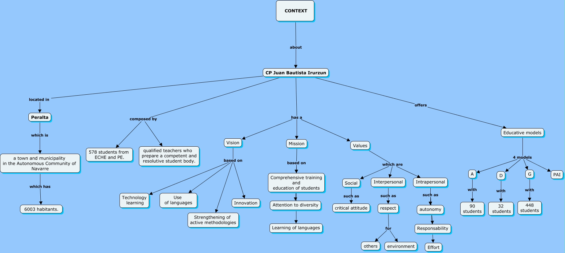 Este Cmap, tiene información relacionada con: Context, Mission based on Comprehensive training and education of students, G with 448 students, Mission based on Attention to diversity, CP Juan Bautista Irurzun composed by qualified teachers who prepare a competent and resolutive student body., Social such as critical attitude, respect for others, Vision based on Strengthening of active methodologies, Educative models 4 models D, CP Juan Bautista Irurzun has a Mission, Intrapersonal such as Responsability, a town and municipality in the Autonomous Community of Navarre which has 6003 habitants., Values which are Social, Values which are Interpersonal, D with 32 students, Educative models 4 models PAI, Educative models 4 models A, CP Juan Bautista Irurzun offers Educative models, Mission based on Comprehensive training and education of students, Intrapersonal such as autonomy, CP Juan Bautista Irurzun has a Values