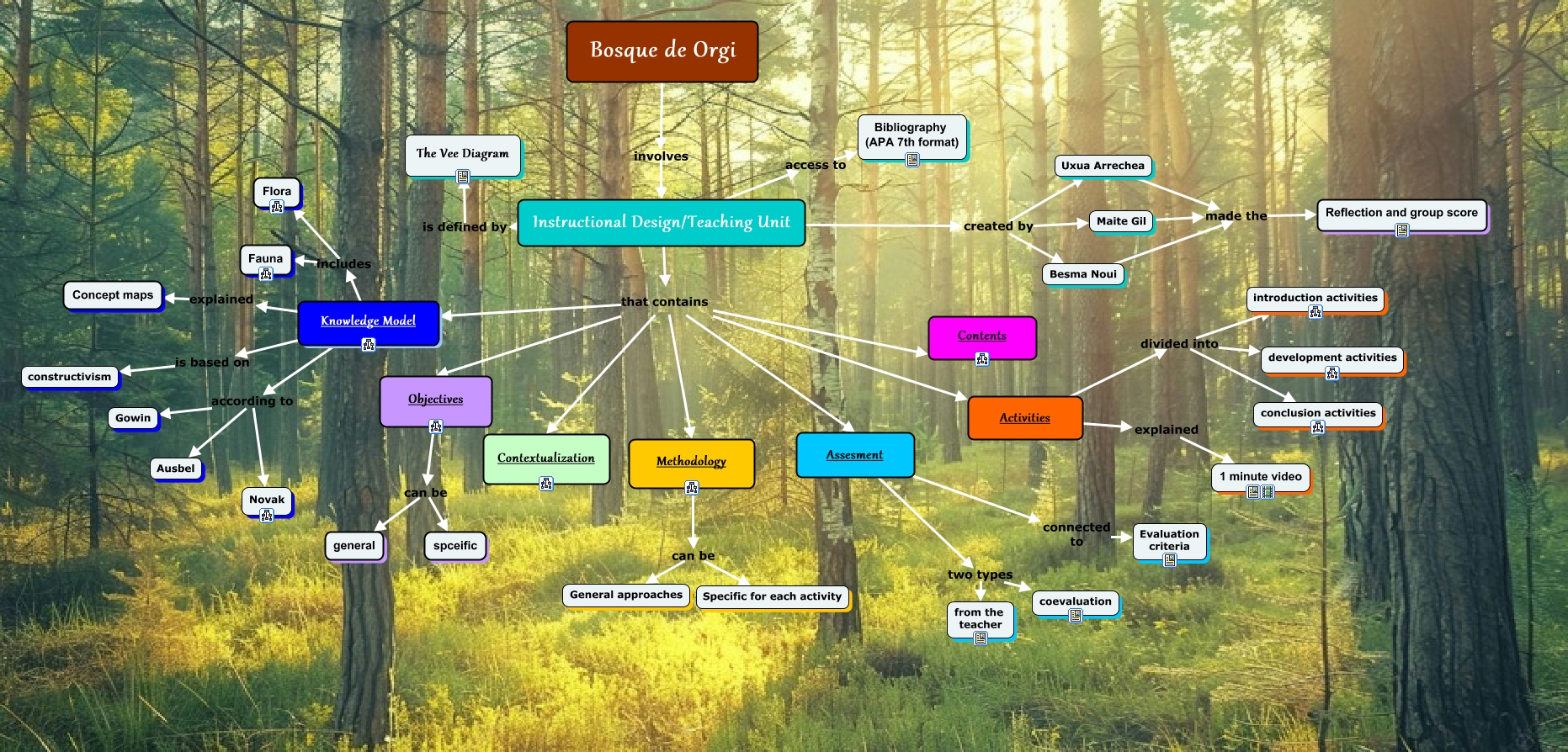 Este Cmap, tiene información relacionada con: Bosque de orgi, Instructional Design/Teaching Unit created by Besma Noui, Objectives can be spceific, Instructional Design/Teaching Unit created by Uxua Arrechea, Knowledge Model is based on constructivism, Knowledge Model explained Concept maps, Assesment two types coevaluation, Instructional Design/Teaching Unit that contains Assesment, Methodology can be General approaches, Instructional Design/Teaching Unit that contains Contents, Methodology can be Specific for each activity, Instructional Design/Teaching Unit that contains Objectives, Instructional Design/Teaching Unit is defined by The Vee Diagram, Activities explained 1 minute video, Bosque de Orgi involves Instructional Design/Teaching Unit, Knowledge Model according to Novak, Assesment connected to Evaluation criteria, Knowledge Model according to Gowin, Instructional Design/Teaching Unit that contains Methodology, Activities divided into introduction activities, Instructional Design/Teaching Unit that contains Contextualization