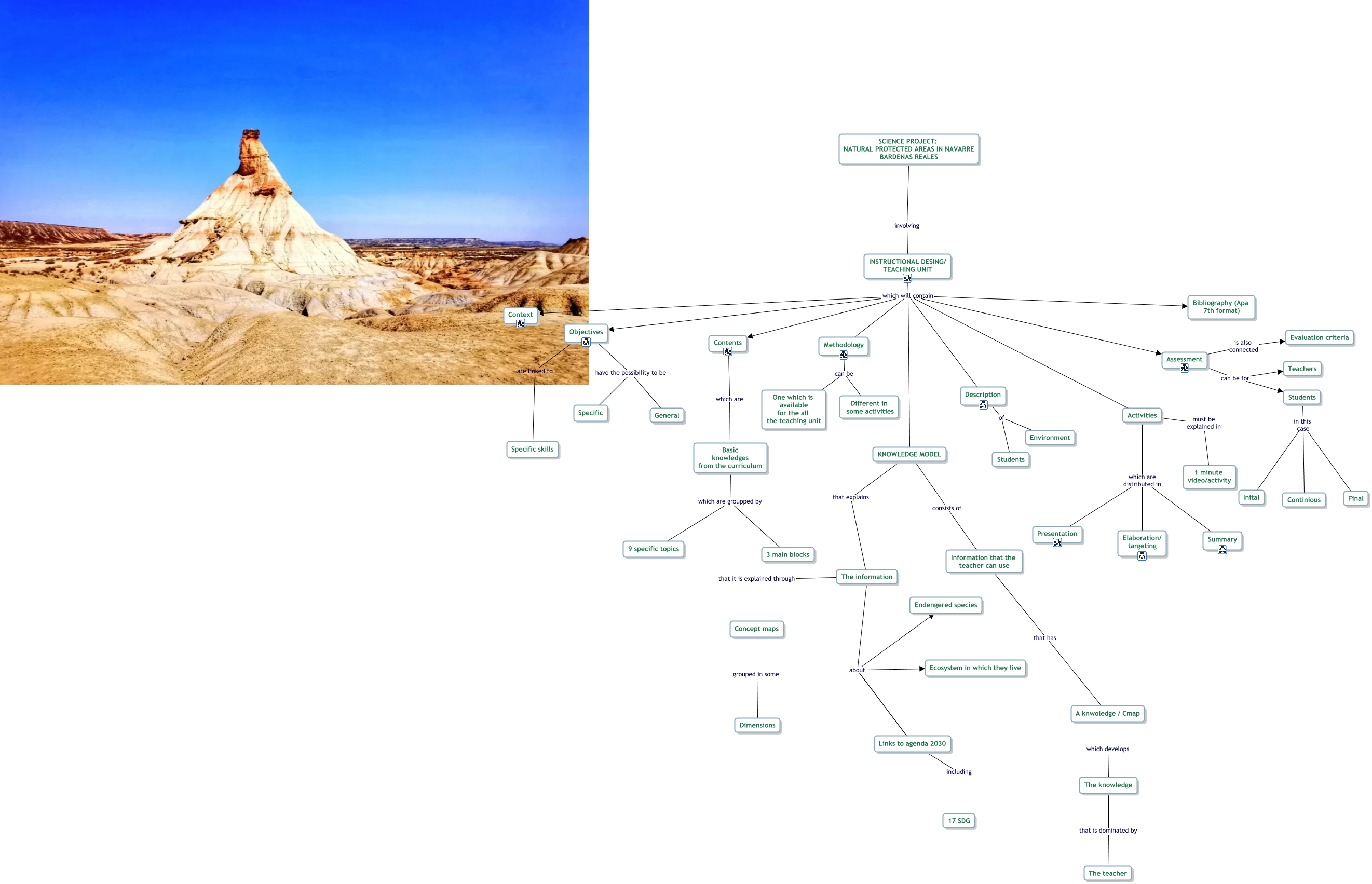 Este Cmap, tiene información relacionada con: INSTRUCTIONAL MODULE, Basic knowledges from the curriculum which are groupped by 3 main blocks, The information that it is explained through Concept maps, The information about Links to agenda 2030, INSTRUCTIONAL DESING/ TEACHING UNIT which will contain KNOWLEDGE MODEL, SCIENCE PROJECT: NATURAL PROTECTED AREAS IN NAVARRE BARDENAS REALES involving INSTRUCTIONAL DESING/ TEACHING UNIT, The information about Endengered species, INSTRUCTIONAL DESING/ TEACHING UNIT which will contain Assessment, Links to agenda 2030 including 17 SDG, Information that the teacher can use that has A knwoledge / Cmap, Description of Students, Methodology can be One which is available for the all the teaching unit, Students in this case Final, Description of Environment, Activities which are distributed in Presentation, INSTRUCTIONAL DESING/ TEACHING UNIT which will contain Context, The information about Ecosystem in which they live, Students in this case Continious, INSTRUCTIONAL DESING/ TEACHING UNIT which will contain Description, Objectives are linked to Specific skills, Assessment is also connected Evaluation criteria