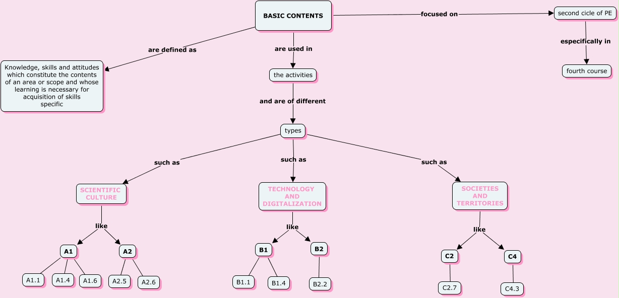 Este Cmap, tiene información relacionada con: Basic contents, TECHNOLOGY AND DIGITALIZATION like B2, C4 ???? C4.3, B2 ???? B2.2, B1 ???? B1.1, types such as SOCIETIES AND TERRITORIES, TECHNOLOGY AND DIGITALIZATION like B1, A1 ???? A1.1, types such as TECHNOLOGY AND DIGITALIZATION, BASIC CONTENTS focused on second cicle of PE, A1 ???? A1.6, A1 ???? A1.4, SOCIETIES AND TERRITORIES like C4, C2 ???? C2.7, SOCIETIES AND TERRITORIES like C2, the activities and are of different types, types such as SCIENTIFIC CULTURE, A2 ???? A2.6, second cicle of PE especifically in fourth course, A2 ???? A2.5, BASIC CONTENTS are used in the activities