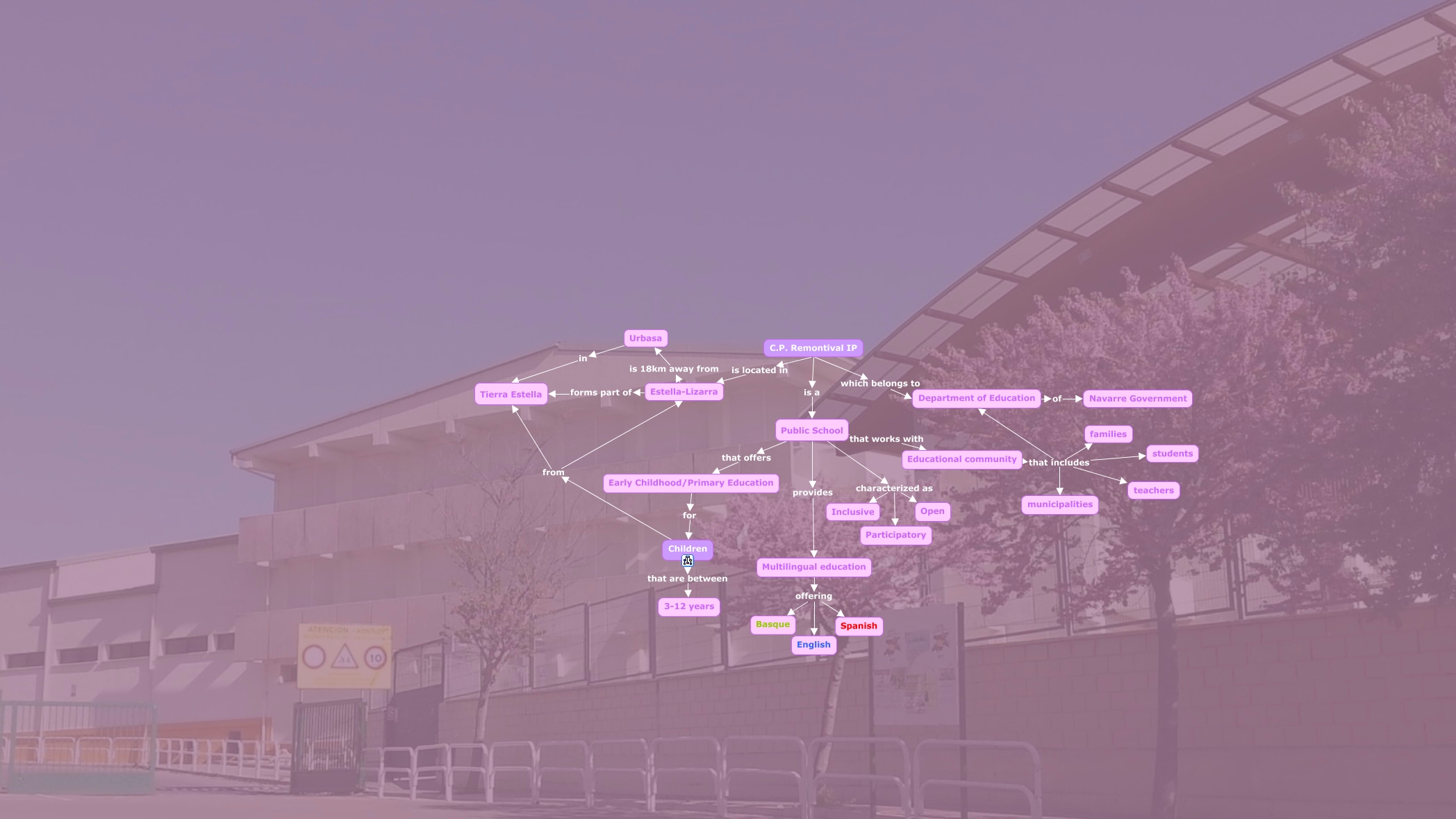 Este Cmap, tiene información relacionada con: 5. CONTEXT, Public School characterized as Open, Multilingual education offering English, Public School characterized as Participatory, C.P. Remontival IP is located in Estella-Lizarra, Multilingual education offering Spanish, C.P. Remontival IP which belongs to Department of Education, Public School characterized as Inclusive, Estella-Lizarra is 18km away from Urbasa, Children that are between 3-12 years, Public School that offers Early Childhood/Primary Education, Children from Estella-Lizarra, Children from Tierra Estella, Department of Education of Navarre Government, Multilingual education offering Basque, Public School provides Multilingual education, Educational community that includes municipalities, Educational community that includes families, C.P. Remontival IP is a Public School, Early Childhood/Primary Education for Children, Educational community that includes teachers