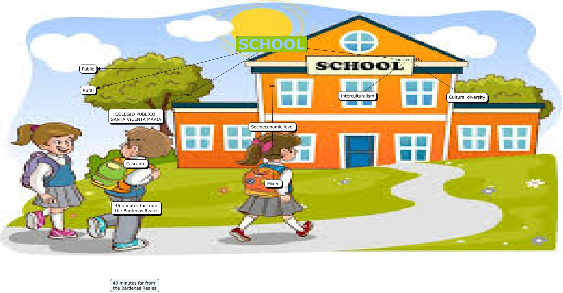 Este Cmap, tiene información relacionada con: SCHOOL, SCHOOL characterized by Interculturalism, SCHOOL is Public, SCHOOL has Socioeconomic level, SCHOOL characterized by Cultural diversity, Cascante that is 45 minutes far from the Bardenas Reales, SCHOOL named COLEGIO PÚBLICO SANTA VICENTA MARIA, SCHOOL is Rural, Socioeconomic level which is Mixed, COLEGIO PÚBLICO SANTA VICENTA MARIA located in Cascante