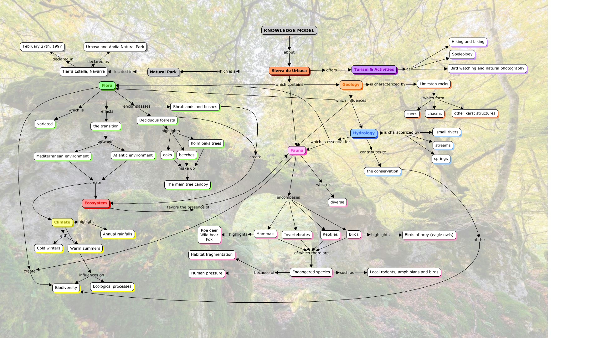 Este Cmap, tiene información relacionada con: 5. KNOWLEDGE MODEL, Geology is characterized by Limeston rocks, KNOWLEDGE MODEL about Sierra de Urbasa, Hydrology is characterized by streams, Fauna which is diverse, Geology which influences Fauna, Mammals highlights Roe deer Wild boar Fox, beeches make up The main tree canopy, Birds of which there are Endangered species, Shrublands and bushes create Ecosystem, Turism & Activities as Bird watching and natural photography, Deciduous fosrests highlights oaks, Climate influences on Biodiversity, Fauna encompases Invertebrates, Hydrology which is essential for Flora, Natural Park located in Tierra Estella, Navarre, Fauna encompases Mammals, Mediterranean environment create Ecosystem, Deciduous fosrests create Ecosystem, Geology which influences Flora, Sierra de Urbasa which contains Geology