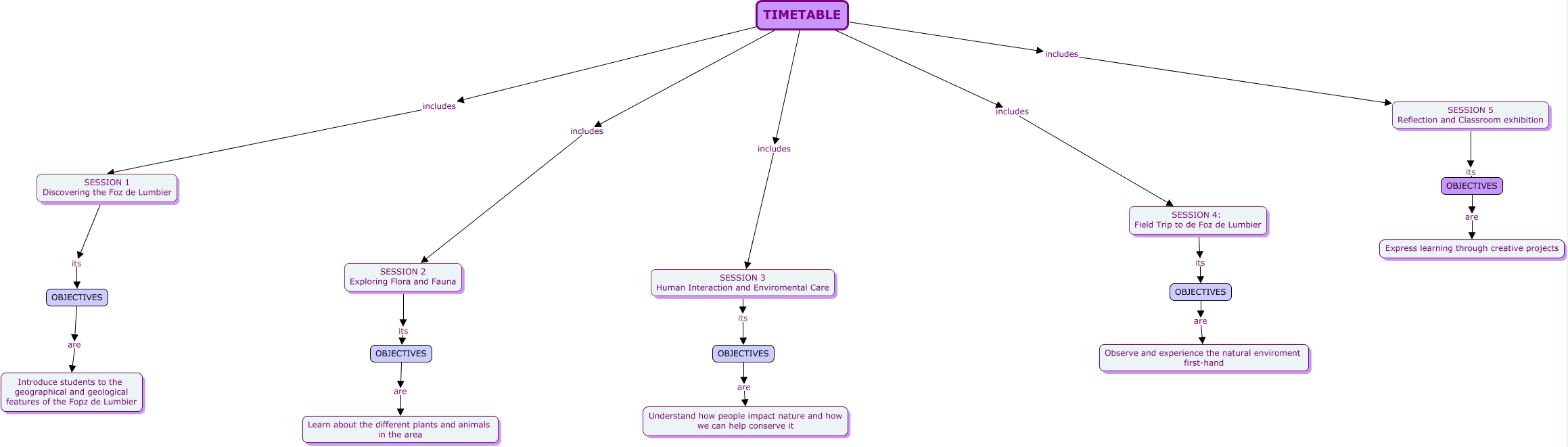 Este Cmap, tiene información relacionada con: timetable, OBJECTIVES are Understand how people impact nature and how we can help conserve it, TIMETABLE includes SESSION 4: Field Trip to de Foz de Lumbier, SESSION 5 Reflection and Classroom exhibition its OBJECTIVES, OBJECTIVES are Express learning through creative projects, OBJECTIVES are Introduce students to the geographical and geological features of the Fopz de Lumbier, TIMETABLE includes SESSION 2 Exploring Flora and Fauna, SESSION 1 Discovering the Foz de Lumbier its OBJECTIVES, SESSION 2 Exploring Flora and Fauna its OBJECTIVES, OBJECTIVES are Learn about the different plants and animals in the area, TIMETABLE includes SESSION 1 Discovering the Foz de Lumbier, SESSION 4: Field Trip to de Foz de Lumbier its OBJECTIVES, TIMETABLE includes SESSION 5 Reflection and Classroom exhibition, SESSION 3 Human Interaction and Enviromental Care its OBJECTIVES, TIMETABLE includes SESSION 3 Human Interaction and Enviromental Care, OBJECTIVES are Observe and experience the natural enviroment first-hand