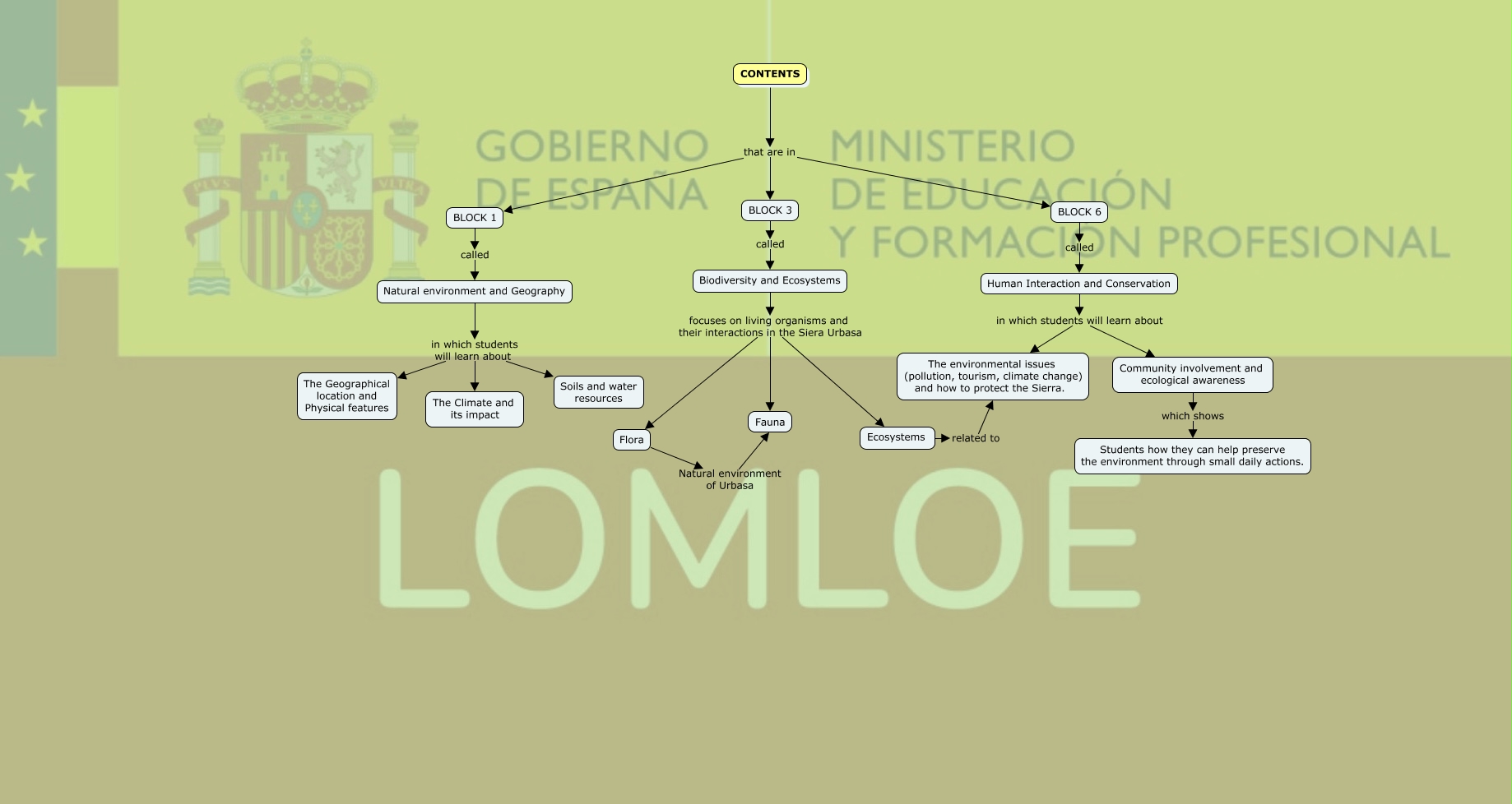 Este Cmap, tiene información relacionada con: 5. CONTENTS, Biodiversity and Ecosystems focuses on living organisms and their interactions in the Siera Urbasa Flora, Natural environment and Geography in which students will learn about The Climate and its impact, Natural environment and Geography in which students will learn about The Geographical location and Physical features, CONTENTS that are in BLOCK 1, Community involvement and ecological awareness which shows Students how they can help preserve the environment through small daily actions., Human Interaction and Conservation in which students will learn about Community involvement and ecological awareness, CONTENTS that are in BLOCK 6, Biodiversity and Ecosystems focuses on living organisms and their interactions in the Siera Urbasa Fauna, BLOCK 6 called Human Interaction and Conservation, CONTENTS that are in BLOCK 3, BLOCK 3 called Biodiversity and Ecosystems, Ecosystems related to The environmental issues (pollution, tourism, climate change) and how to protect the Sierra., Biodiversity and Ecosystems focuses on living organisms and their interactions in the Siera Urbasa Ecosystems, Natural environment and Geography in which students will learn about Soils and water resources, BLOCK 1 called Natural environment and Geography, Human Interaction and Conservation in which students will learn about The environmental issues (pollution, tourism, climate change) and how to protect the Sierra., Flora Natural environment of Urbasa Fauna
