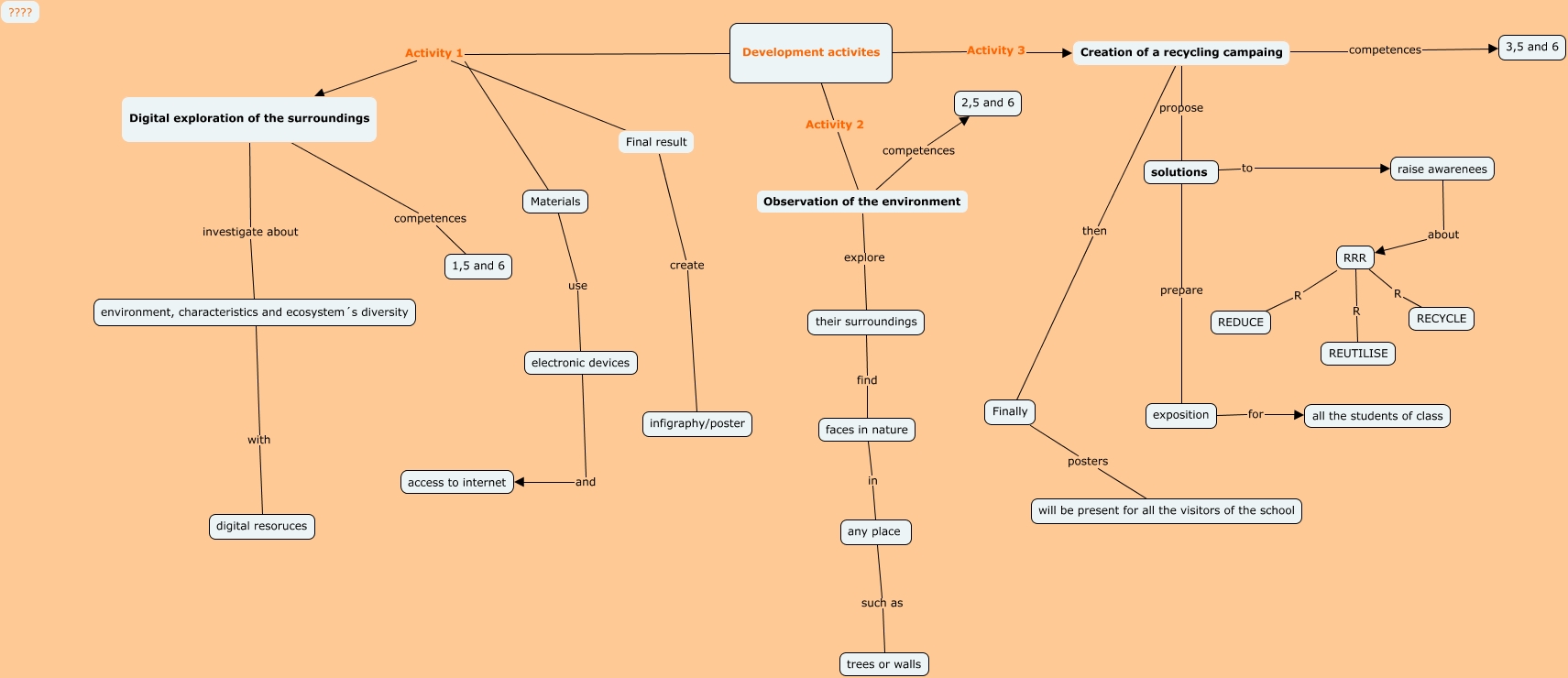 Este Cmap, tiene información relacionada con: Activities for development, Observation of the environment competences 2,5 and 6, Development activites Activity 1 Digital exploration of the surroundings, RRR R RECYCLE, raise awarenees about RRR, any place such as trees or walls, solutions prepare exposition, Creation of a recycling campaing propose solutions, exposition for all the students of class, their surroundings find faces in nature, Development activites Activity 1 Materials, Final result create infigraphy/poster, Observation of the environment explore their surroundings, faces in nature in any place, Materials use electronic devices, Digital exploration of the surroundings investigate about environment, characteristics and ecosystem´s diversity, Digital exploration of the surroundings competences 1,5 and 6, Development activites Activity 3 Creation of a recycling campaing, Finally posters will be present for all the visitors of the school, RRR R REDUCE, solutions to raise awarenees