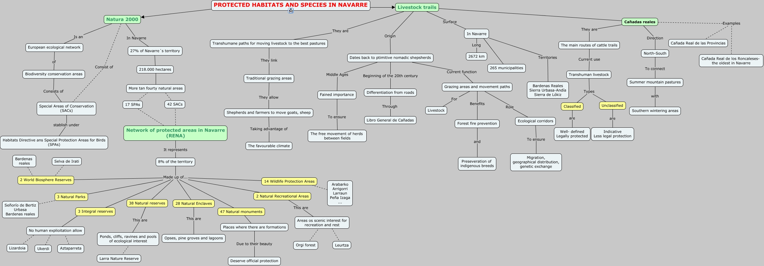 Este Cmap, tiene información relacionada con: CMAP GROUP 8, Summer mountain pastures with Southern wintering areas, 27% of Navarre´s territory ???? 218.000 hectares, Areas os scenic interest for recreation and rest ???? Leurtza, 2 Natural Recreational Areas Made up of... 47 Natural monuments, Transhumane paths for moving livestock to the best pastures They link Traditional grazing areas, No human explioitation allow ???? Ukerdi, 14 Wildlife Protection Areas Made up of... 47 Natural monuments, Grazing areas and movement paths Role Ecological corridors, 14 Wildlife Protection Areas Made up of... 28 Natural Enclaves, Natura 2000 Is an European ecological network, Forest fire prevention and Preseveration of indigenous breeds, 8% of the territory Made up of... 28 Natural Enclaves, 3 Natural Parks Made up of... 28 Natural Enclaves, 47 Natural monuments ???? Places where there are formations, 3 Natural Parks Made up of... 47 Natural monuments, Places where there are formations Due to their beauty Deserve official protection, 2 Natural Recreational Areas Made up of... 28 Natural Enclaves, Transhuman livestock Types Unclassified, 218.000 hectares ???? More tan fourty natural areas, 2 World Biosphere Reserves Made up of... 47 Natural monuments