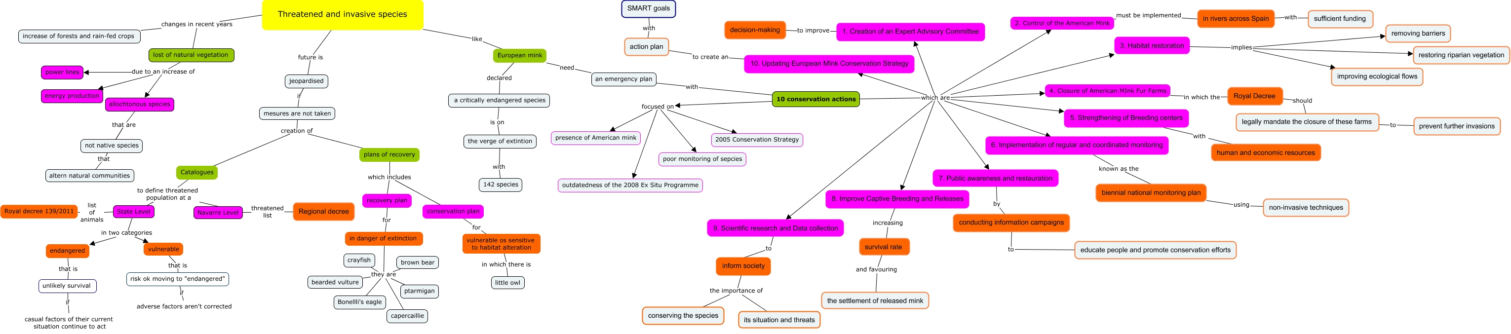 Este Cmap, tiene información relacionada con: Threatened and invasive species, jeopardised if mesures are not taken, 6. Implementation of regular and coordinated monitoring known as the biennial national monitoring plan, the verge of extintion with 142 species, State Level in two categories vulnerable, 7. Public awareness and restauration by conducting information campaigns, survival rate and favouring the settlement of released mink, European mink need an emergency plan, action plan with SMART goals, in danger of extinction they are bearded vulture, Catalogues to define threatened population at a Navarre Level, Navarre Level threatened list Regional decree, Threatened and invasive species like European mink, in rivers across Spain with sufficient funding, 3. Habitat restoration implies restoring riparian vegetation, allochtonous species that are not native species, plans of recovery which includes recovery plan, 10 conservation actions which are 3. Habitat restoration, 9. Scientific research and Data collection to inform society, inform society the importance of conserving the species, conservation plan for vulnerable os sensitive to habitat alteration