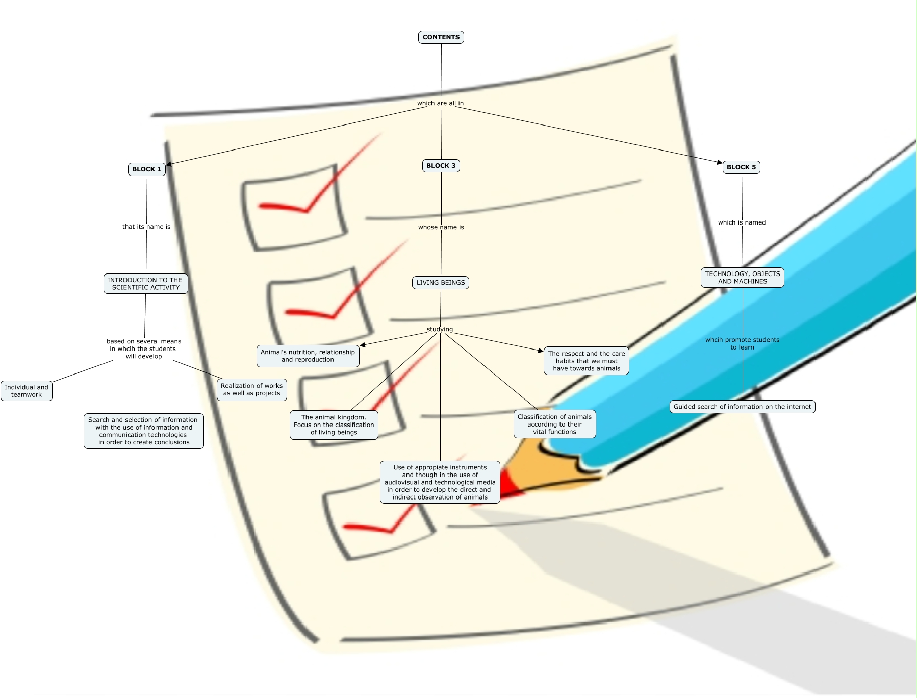 Este Cmap, tiene información relacionada con: CONTENTS, CONTENTS which are all in BLOCK 3, TECHNOLOGY, OBJECTS AND MACHINES whcih promote students to learn Guided search of information on the internet, INTRODUCTION TO THE SCIENTIFIC ACTIVITY based on several means in whcih the students will develop Realization of works as well as projects, BLOCK 3 whose name is LIVING BEINGS, LIVING BEINGS studying Use of appropiate instruments and though in the use of audiovisual and technological media in order to develop the direct and indirect observation of animals, CONTENTS which are all in BLOCK 1, LIVING BEINGS studying The animal kingdom. Focus on the classification of living beings, LIVING BEINGS studying The respect and the care habits that we must have towards animals, LIVING BEINGS studying Classification of animals according to their vital functions, INTRODUCTION TO THE SCIENTIFIC ACTIVITY based on several means in whcih the students will develop Individual and teamwork, CONTENTS which are all in BLOCK 5, BLOCK 1 that its name is INTRODUCTION TO THE SCIENTIFIC ACTIVITY, BLOCK 5 which is named TECHNOLOGY, OBJECTS AND MACHINES, LIVING BEINGS studying Animal's nutrition, relationship and reproduction, INTRODUCTION TO THE SCIENTIFIC ACTIVITY based on several means in whcih the students will develop Search and selection of information with the use of information and communication technologies in order to create conclusions