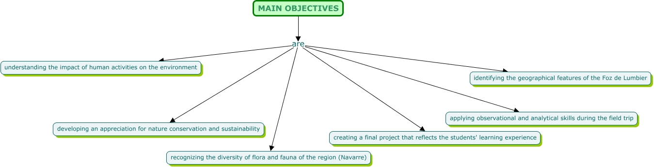 Este Cmap, tiene información relacionada con: main objectives, MAIN OBJECTIVES are developing an appreciation for nature conservation and sustainability, MAIN OBJECTIVES are identifying the geographical features of the Foz de Lumbier, MAIN OBJECTIVES are understanding the impact of human activities on the environment, MAIN OBJECTIVES are creating a final project that reflects the students' learning experience, MAIN OBJECTIVES are applying observational and analytical skills during the field trip, MAIN OBJECTIVES are recognizing the diversity of flora and fauna of the region (Navarre)