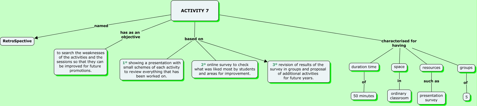 Este Cmap, tiene información relacionada con: Activity 7, ACTIVITY 7 has as an objective to search the weaknesses of the activities and the sessions so that they can be improved for future promotions., groups of 5, ACTIVITY 7 based on 3º revision of results of the survey in groups and proposal of additional activities for future years., ACTIVITY 7 characterised for having space, ACTIVITY 7 based on 2º online survey to check what was liked most by students and areas for improvement., ACTIVITY 7 named RetroSpective, duration time of 50 minutes, ACTIVITY 7 characterised for having duration time, ACTIVITY 7 characterised for having resources, space in ordinary classroom, resources such as presentation survey, ACTIVITY 7 based on 1º showing a presentation with small schemes of each activity to review everything that has been worked on., ACTIVITY 7 characterised for having groups