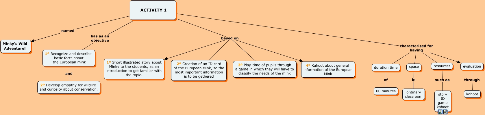 Este Cmap, tiene información relacionada con: Activity 1, ACTIVITY 1 based on 3º Play-time of pupils through a game in which they will have to classify the needs of the mink, space in ordinary classroom, ACTIVITY 1 based on 1º Short illustrated story about Minky to the students, as an introduction to get familiar with the topic., duration time of 60 minutes, ACTIVITY 1 has as an objective 1º Recognize and describe basic facts about the European mink, ACTIVITY 1 characterised for having duration time, ACTIVITY 1 based on 2º Creation of an ID card of the European Mink, so the most important information is to be gethered, evaluation through kahoot, ACTIVITY 1 characterised for having space, ACTIVITY 1 characterised for having resources, ACTIVITY 1 characterised for having evaluation, ACTIVITY 1 named Minky's Wild Adventure!, ACTIVITY 1 based on 4º Kahoot about general information of the European Mink, 1º Recognize and describe basic facts about the European mink and 2º Develop empathy for wildlife and curiosity about conservation., resources such as story ID game kahoot