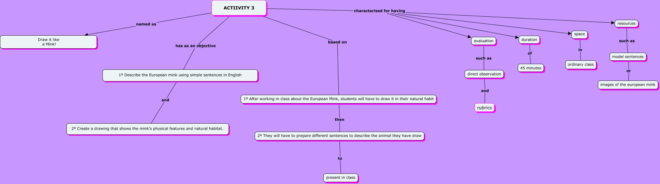 Este Cmap, tiene información relacionada con: Activity 3, ACTIIVITY 3 characterised for having resources, 1º After working in class about the European Mink, students will have to draw it in their natural habit then 2º They will have to prepare different sentences to describe the animal they have draw, direct observation and rubrics, 2º They will have to prepare different sentences to describe the animal they have draw to present in class, ACTIIVITY 3 based on 1º After working in class about the European Mink, students will have to draw it in their natural habit, space in ordinary class, resources such as model sentences, 1º Describe the European mink using simple sentences in English and 2º Create a drawing that shows the mink’s physical features and natural habitat., ACTIIVITY 3 characterised for having evaluation, duration of 45 minutes, model sentences or images of the european mink, ACTIIVITY 3 characterised for having space, ACTIIVITY 3 characterised for having duration, ACTIIVITY 3 named as Draw it like a Mink!, evaluation such as direct observation, ACTIIVITY 3 has as an objective 1º Describe the European mink using simple sentences in English