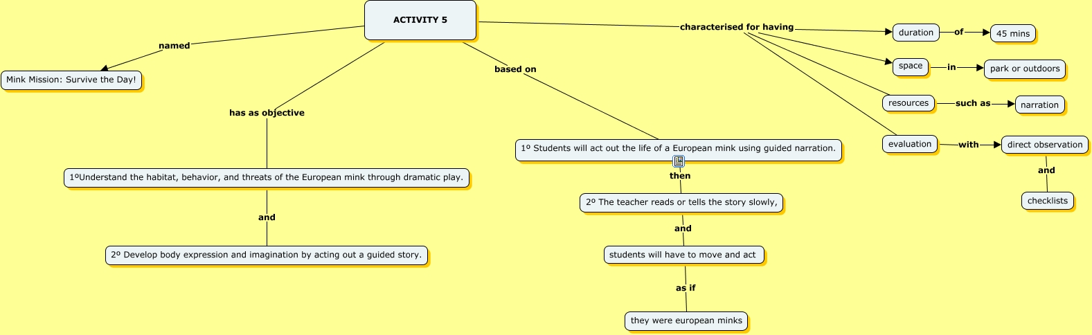 Este Cmap, tiene información relacionada con: Activity 5, ACTIVITY 5 has as objective 1ºUnderstand the habitat, behavior, and threats of the European mink through dramatic play., space in park or outdoors, direct observation and checklists, ACTIVITY 5 named Mink Mission: Survive the Day!, students will have to move and act as if they were european minks, ACTIVITY 5 characterised for having duration, ACTIVITY 5 based on 1º Students will act out the life of a European mink using guided narration., duration of 45 mins, resources such as narration, ACTIVITY 5 characterised for having evaluation, evaluation with direct observation, ACTIVITY 5 characterised for having space, ACTIVITY 5 characterised for having resources, 2º The teacher reads or tells the story slowly, and students will have to move and act, 1º Students will act out the life of a European mink using guided narration. then 2º The teacher reads or tells the story slowly,, 1ºUnderstand the habitat, behavior, and threats of the European mink through dramatic play. and 2º Develop body expression and imagination by acting out a guided story.