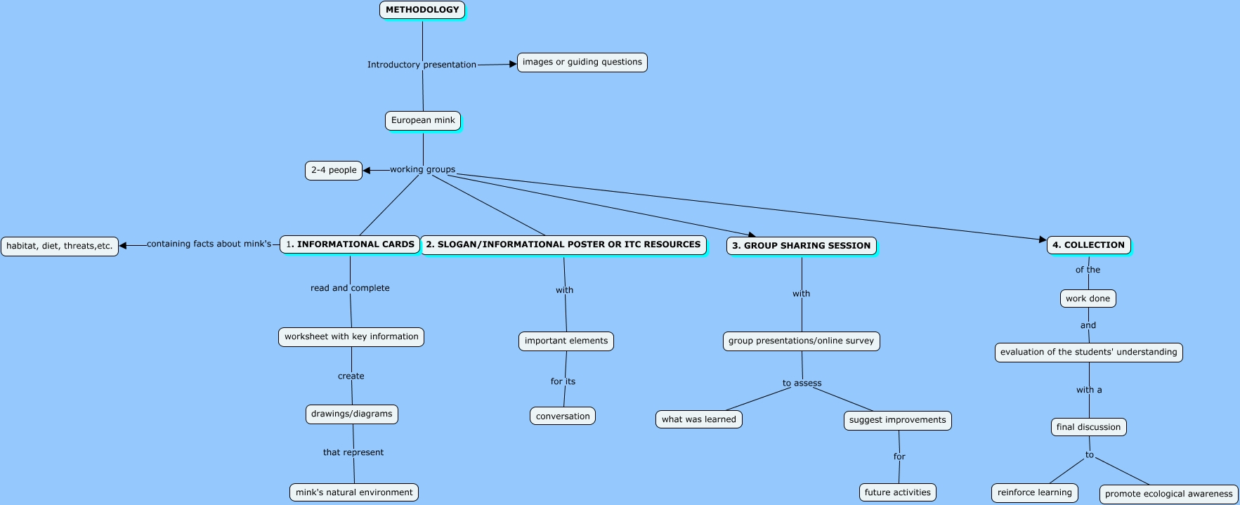 Este Cmap, tiene información relacionada con: Methodology, group presentations/online survey to assess suggest improvements, final discussion to reinforce learning, European mink working groups 1. INFORMATIONAL CARDS, 1. INFORMATIONAL CARDS read and complete worksheet with key information, group presentations/online survey to assess what was learned, 4. COLLECTION of the work done, suggest improvements for future activities, European mink working groups 4. COLLECTION, METHODOLOGY Introductory presentation images or guiding questions, work done and evaluation of the students' understanding, evaluation of the students' understanding with a final discussion, METHODOLOGY Introductory presentation European mink, important elements for its conversation, drawings/diagrams that represent mink's natural environment, 2. SLOGAN/INFORMATIONAL POSTER OR ITC RESOURCES with important elements, worksheet with key information create drawings/diagrams, European mink working groups 2-4 people, 1. INFORMATIONAL CARDS containing facts about mink's habitat, diet, threats,etc., European mink working groups 3. GROUP SHARING SESSION, 3. GROUP SHARING SESSION with group presentations/online survey