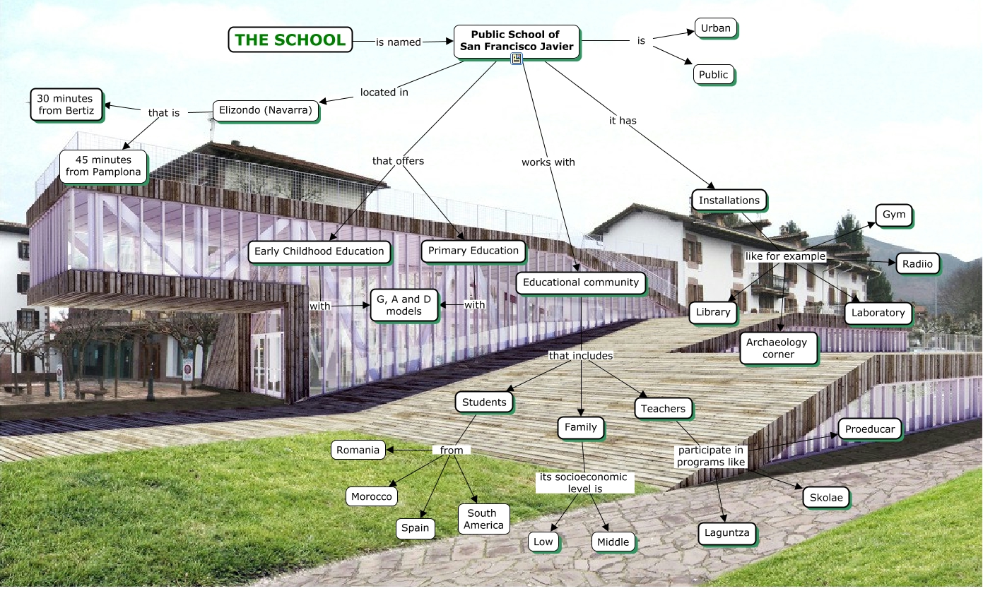 Este Cmap, tiene información relacionada con: CONTEXTUALIZATION, Early Childhood Education with G, A and D models, Teachers participate in programs like Proeducar, Students from Romania, Elizondo (Navarra) that is 45 minutes from Pamplona, Primary Education with G, A and D models, Students from Spain, Public School of San Francisco Javier that offers Early Childhood Education, Educational community that includes Teachers, Educational community that includes Students, Students from South America, Public School of San Francisco Javier is Public, Teachers participate in programs like Laguntza, Installations like for example Laboratory, Family its socioeconomic level is Middle, Installations like for example Gym, Installations like for example Radiio, THE SCHOOL is named Public School of San Francisco Javier, Public School of San Francisco Javier it has Installations, Public School of San Francisco Javier works with Educational community, Public School of San Francisco Javier that offers Primary Education