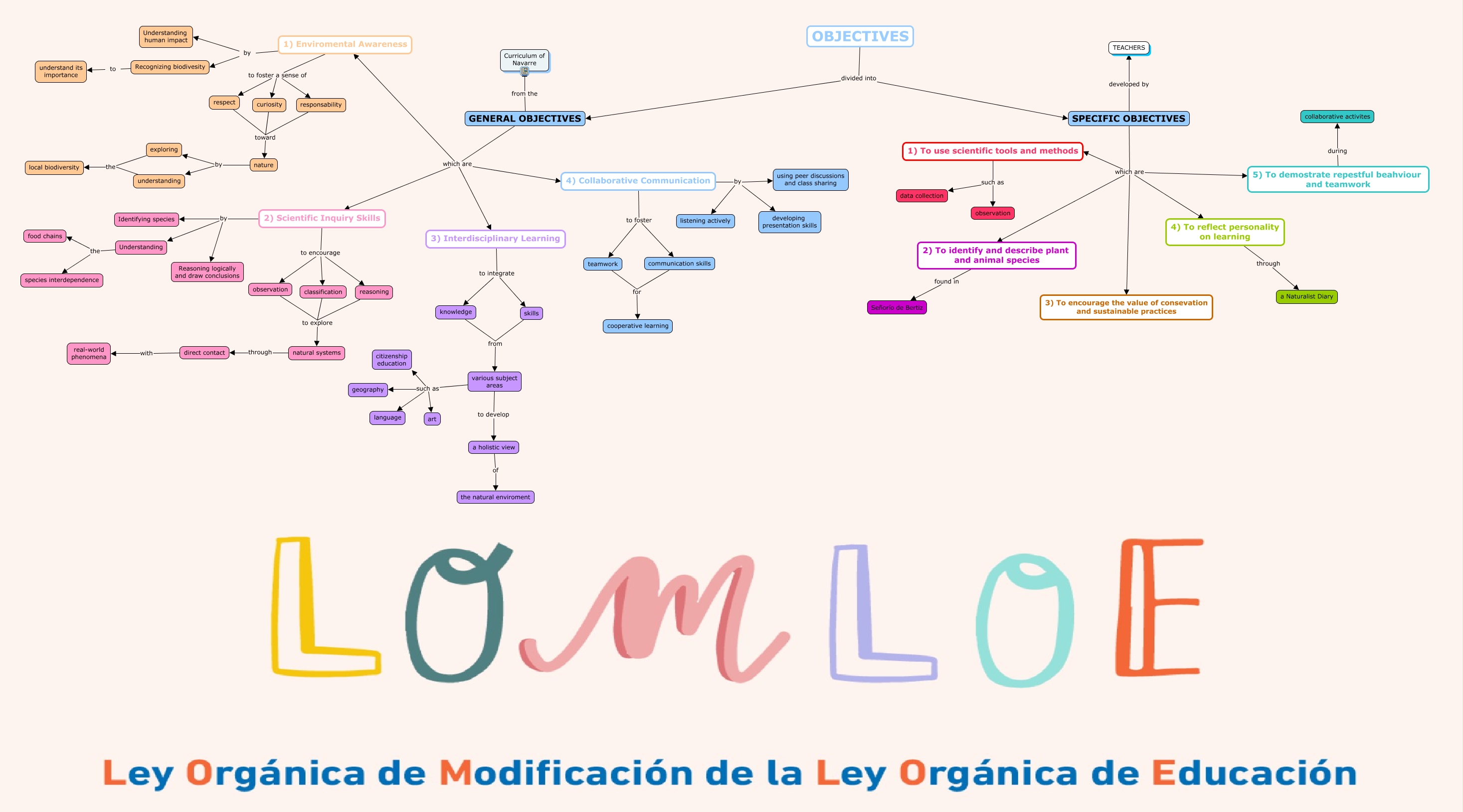 Este Cmap, tiene información relacionada con: OBJECTIVES, 2) Scientific Inquiry Skills by Reasoning logically and draw conclusions, SPECIFIC OBJECTIVES developed by TEACHERS, observation to explore natural systems, various subject areas such as citizenship education, natural systems through direct contact, respect toward nature, GENERAL OBJECTIVES from the Curriculum of Navarre, nature by understanding, 3) Interdisciplinary Learning to integrate knowledge, 1) To use scientific tools and methods such as observation, 3) Interdisciplinary Learning to integrate skills, responsability toward nature, 2) Scientific Inquiry Skills to encourage observation, teamwork for cooperative learning, OBJECTIVES divided into GENERAL OBJECTIVES, Understanding the food chains, 2) Scientific Inquiry Skills by Identifying species, direct contact with real-world phenomena, classification to explore natural systems, Understanding the species interdependence