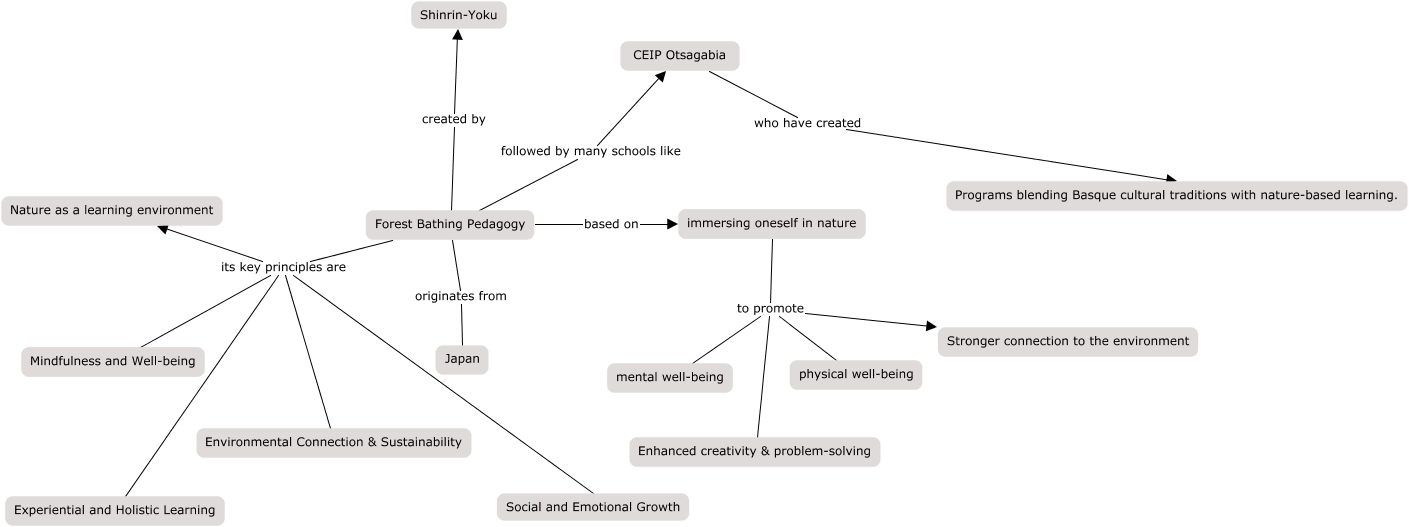 This Concept Map, created with IHMC CmapTools, has information related to: Forest bathing pedagogy, Forest Bathing Pedagogy followed by many schools like CEIP Otsagabia, Forest Bathing Pedagogy its key principles are Mindfulness and Well-being, immersing oneself in nature to promote mental well-being, Forest Bathing Pedagogy based on immersing oneself in nature, immersing oneself in nature to promote physical well-being, immersing oneself in nature to promote Stronger connection to the environment, Forest Bathing Pedagogy its key principles are Social and Emotional Growth, CEIP Otsagabia who have created Programs blending Basque cultural traditions with nature-based learning., Forest Bathing Pedagogy originates from Japan, Forest Bathing Pedagogy its key principles are Experiential and Holistic Learning, Forest Bathing Pedagogy its key principles are Nature as a learning environment, Forest Bathing Pedagogy created by Shinrin-Yoku, Forest Bathing Pedagogy its key principles are Environmental Connection & Sustainability, immersing oneself in nature to promote Enhanced creativity & problem-solving