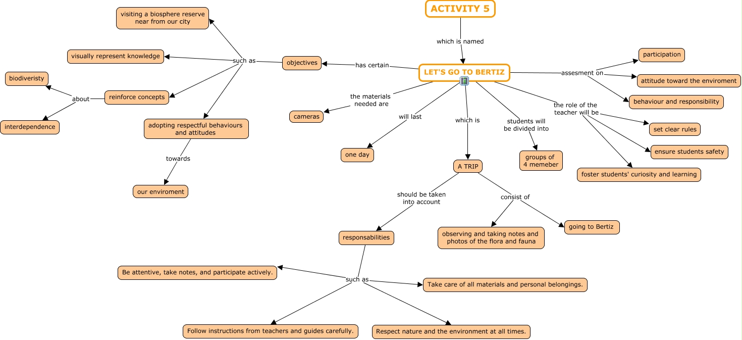 Este Cmap, tiene información relacionada con: ACTIVITY 5, LET'S GO TO BERTIZ students will be divided into groups of 4 memeber, responsabilities such as Be attentive, take notes, and participate actively., objectives such as reinforce concepts, objectives such as visiting a biosphere reserve near from our city, LET'S GO TO BERTIZ has certain objectives, objectives such as adopting respectful behaviours and attitudes, adopting respectful behaviours and attitudes towards our enviroment, reinforce concepts about biodiveristy, LET'S GO TO BERTIZ will last one day, responsabilities such as Respect nature and the environment at all times., LET'S GO TO BERTIZ the role of the teacher will be set clear rules, A TRIP should be taken into account responsabilities, ACTIVITY 5 which is named LET'S GO TO BERTIZ, LET'S GO TO BERTIZ the role of the teacher will be ensure students safety, LET'S GO TO BERTIZ which is A TRIP, A TRIP consist of observing and taking notes and photos of the flora and fauna, objectives such as visually represent knowledge, LET'S GO TO BERTIZ assesment on participation, reinforce concepts about interdependence, A TRIP consist of going to Bertiz