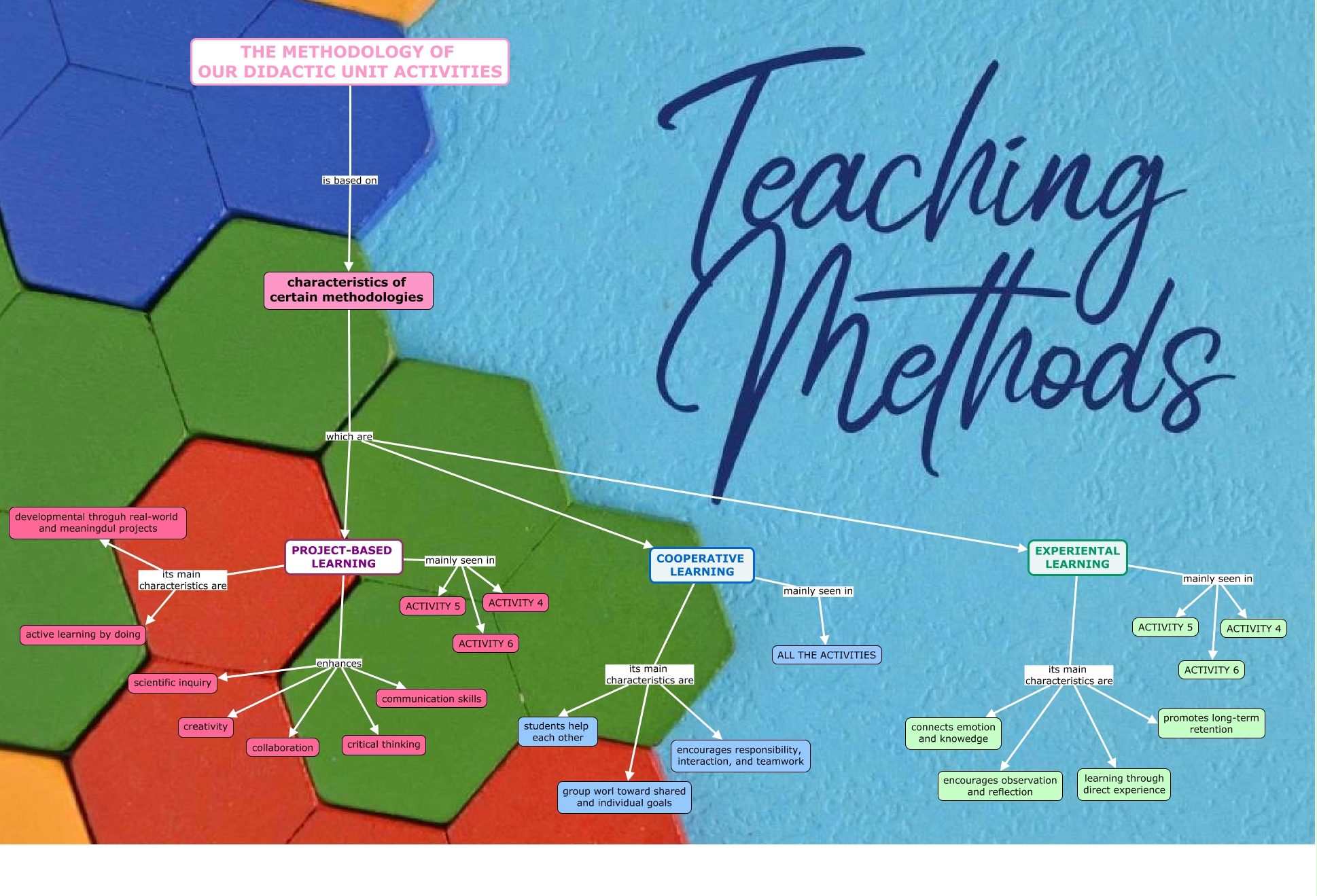 Este Cmap, tiene información relacionada con: METHODOLOGY, characteristics of certain methodologies which are EXPERIENTAL LEARNING, PROJECT-BASED LEARNING its main characteristics are developmental throguh real-world and meaningdul projects, EXPERIENTAL LEARNING its main characteristics are encourages observation and reflection, EXPERIENTAL LEARNING its main characteristics are promotes long-term retention, EXPERIENTAL LEARNING mainly seen in ACTIVITY 5, PROJECT-BASED LEARNING mainly seen in ACTIVITY 5, COOPERATIVE LEARNING its main characteristics are students help each other, COOPERATIVE LEARNING mainly seen in ALL THE ACTIVITIES, COOPERATIVE LEARNING its main characteristics are group worl toward shared and individual goals, EXPERIENTAL LEARNING mainly seen in ACTIVITY 4, characteristics of certain methodologies which are PROJECT-BASED LEARNING, PROJECT-BASED LEARNING enhances collaboration, PROJECT-BASED LEARNING enhances communication skills, PROJECT-BASED LEARNING enhances scientific inquiry, characteristics of certain methodologies which are COOPERATIVE LEARNING, EXPERIENTAL LEARNING its main characteristics are connects emotion and knowedge, PROJECT-BASED LEARNING enhances creativity, EXPERIENTAL LEARNING its main characteristics are learning through direct experience, PROJECT-BASED LEARNING mainly seen in ACTIVITY 4, PROJECT-BASED LEARNING its main characteristics are active learning by doing
