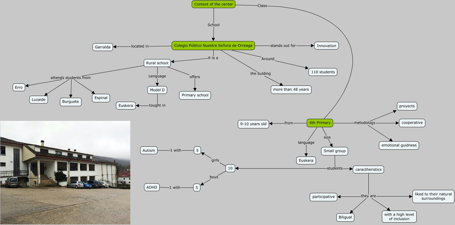Este Cmap, tiene información relacionada con: Context of the center, 4th Primary metodology proyects, Rural school attends students from Espinal, Small group students caractheristics, Colegio Público Nuestra Señora de Orreaga Around 110 students, caractheristics they are liked to their natural surroundings, 4th Primary metodology cooperative, Rural school offers Primary school, Colegio Público Nuestra Señora de Orreaga stands out for Innovation, Colegio Público Nuestra Señora de Orreaga located in Garralda, Rural school attends students from Erro, caractheristics they are with a high level of inclusion, 5 1 with Autism, 10 boys 5, Colegio Público Nuestra Señora de Orreaga it is a Rural school, Context of the center Class 4th Primary, Rural school Lenguage Model D, Rural school attends students from Burguete, 4th Primary from 9-10 years old, caractheristics they are Biligual, 10 girls 5