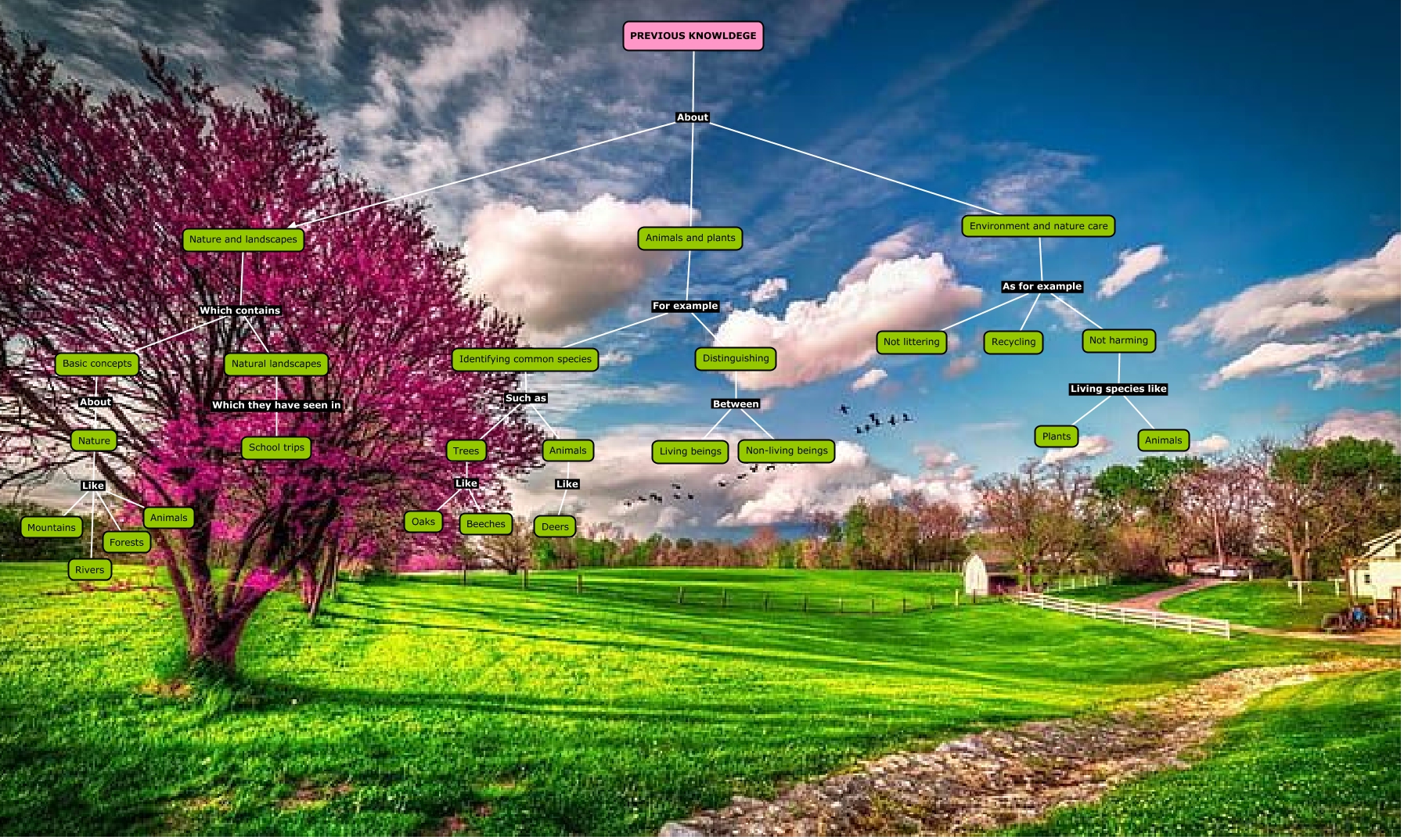 Este Cmap, tiene información relacionada con: Previous knowledge, PREVIOUS KNOWLDEGE About Nature and landscapes, Nature and landscapes Which contains Basic concepts, Environment and nature care As for example Not littering, Identifying common species Such as Animals, Animals and plants For example Identifying common species, Environment and nature care As for example Recycling, Trees Like Oaks, Nature Like Forests, Natural landscapes Which they have seen in School trips, PREVIOUS KNOWLDEGE About Animals and plants, PREVIOUS KNOWLDEGE About Environment and nature care, Nature Like Animals, Identifying common species Such as Trees, Not harming Living species like Animals, Animals Like Deers, Distinguishing Between Living beings, Nature and landscapes Which contains Natural landscapes, Distinguishing Between Non-living beings, Nature Like Rivers, Basic concepts About Nature