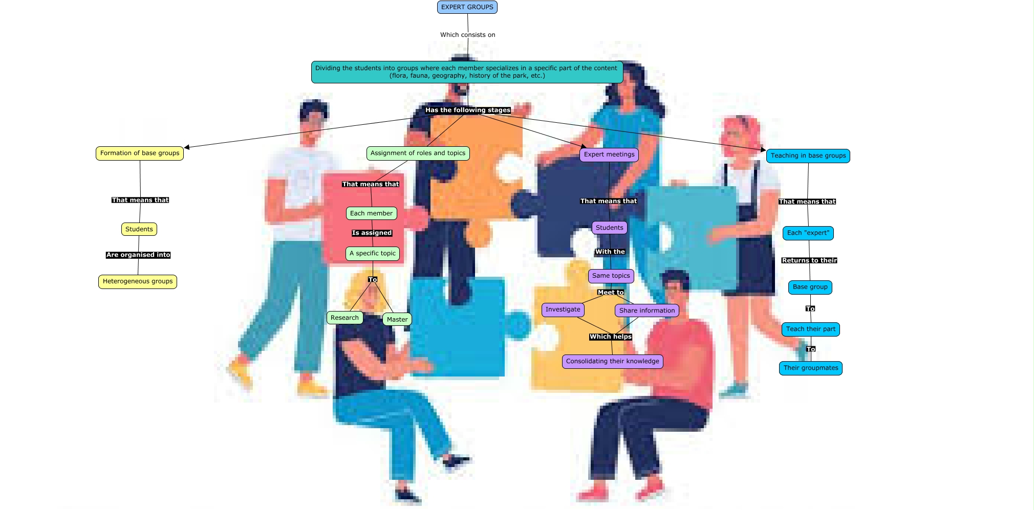 Este Cmap, tiene información relacionada con: Expert groups, Each "expert" Returns to their Base group, Students With the Same topics, Dividing the students into groups where each member specializes in a specific part of the content (flora, fauna, geography, history of the park, etc.) Has the following stages Formation of base groups, Teach their part To Their groupmates, Base group To Teach their part, Same topics Meet to Share information, EXPERT GROUPS Which consists on Dividing the students into groups where each member specializes in a specific part of the content (flora, fauna, geography, history of the park, etc.), Each member Is assigned A specific topic, Dividing the students into groups where each member specializes in a specific part of the content (flora, fauna, geography, history of the park, etc.) Has the following stages Teaching in base groups, A specific topic To Master, Students Are organised into Heterogeneous groups, Assignment of roles and topics That means that Each member, Formation of base groups That means that Students, Investigate Which helps Consolidating their knowledge, Dividing the students into groups where each member specializes in a specific part of the content (flora, fauna, geography, history of the park, etc.) Has the following stages Assignment of roles and topics, Same topics Meet to Investigate, Teaching in base groups That means that Each "expert", Share information Which helps Consolidating their knowledge, A specific topic To Research, Dividing the students into groups where each member specializes in a specific part of the content (flora, fauna, geography, history of the park, etc.) Has the following stages Expert meetings