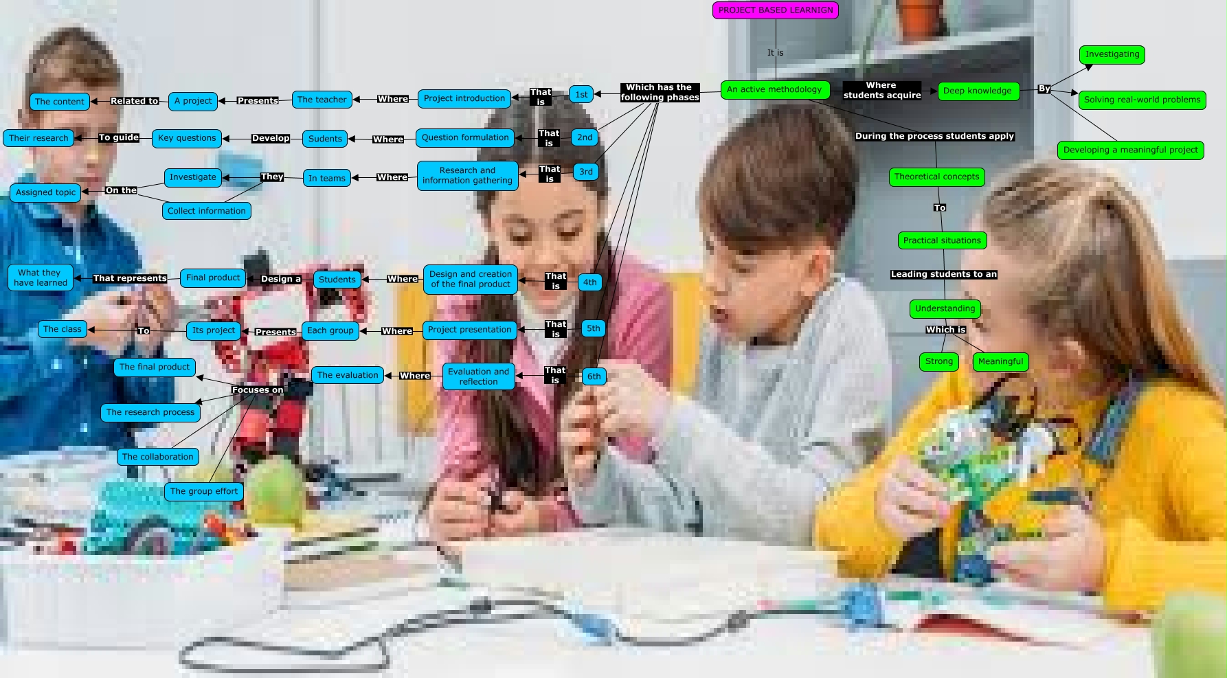 Este Cmap, tiene información relacionada con: Project based learning, PROJECT BASED LEARNIGN It is An active methodology, An active methodology Which has the following phases 2nd, Deep knowledge By Solving real-world problems, Understanding Which is Meaningful, Research and information gathering Where In teams, 2nd That is Question formulation, 6th That is Evaluation and reflection, The evaluation Focuses on The final product, Key questions To guide Their research, Deep knowledge By Investigating, Question formulation Where Sudents, Students Design a Final product, Project presentation Where Each group, Its project To The class, Deep knowledge By Developing a meaningful project, 1st That is Project introduction, 5th That is Project presentation, Evaluation and reflection Where The evaluation, An active methodology Which has the following phases 1st, Collect information On the Assigned topic
