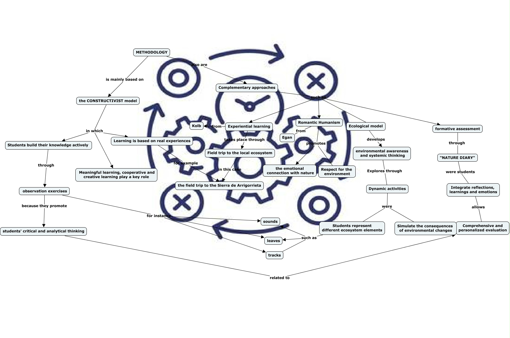 Este Cmap, tiene información relacionada con: methodology, Complementary approaches such as Experiential learning, Complementary approaches such as Romantic Humanism, Students build their knowledge actively through observation exercises, Field trip to the local ecosystem in this case the field trip to the Sierra de Arrigorrieta, METHODOLOGY also are Complementary approaches, Ecological model develops environmental awareness and systemic thinking, Experiential learning from Kolb, Students represent different ecosystem elements such as sounds, the CONSTRUCTIVIST model in which Meaningful learning, cooperative and creative learning play a key role, environmental awareness and systemic thinking Explores through Dynamic activities, Complementary approaches such as formative assessment, the CONSTRUCTIVIST model in which Students build their knowledge actively, Experiential learning takes place through Field trip to the local ecosystem, the CONSTRUCTIVIST model in which Learning is based on real experiences, Romantic Humanism promotes Respect for the environment, observation exercises because they promote students' critical and analytical thinking, observation exercises for instance tracks, students' critical and analytical thinking related to Comprehensive and personalized evaluation, formative assessment through "NATURE DIARY", Students represent different ecosystem elements such as tracks