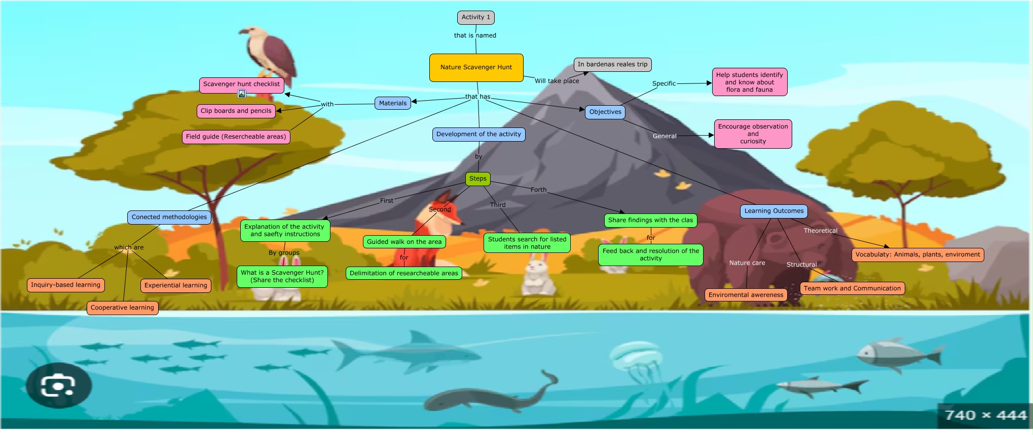 Este Cmap, tiene información relacionada con: Activity 1, Conected methodologies which are Inquiry-based learning, Objectives Specific Help students identify and know about flora and fauna, Nature Scavenger Hunt that has Learning Outcomes, Materials with Clip boards and pencils, Steps Second Guided walk on the area, Guided walk on the area for Delimitation of researcheable areas, Materials with Field guide (Resercheable areas), Conected methodologies which are Experiential learning, Learning Outcomes Theoretical Vocabulaty: Animals, plants, enviroment, Steps Third Students search for listed items in nature, Learning Outcomes Nature care Enviromental awereness, Nature Scavenger Hunt that has Materials, Conected methodologies which are Cooperative learning, Learning Outcomes Structural Team work and Communication, Development of the activity by Steps, Activity 1 that is named Nature Scavenger Hunt, Nature Scavenger Hunt that has Objectives, Explanation of the activity and saefty instructions By groups What is a Scavenger Hunt? (Share the checklist), Steps Forth Share findings with the clas, Materials with Scavenger hunt checklist