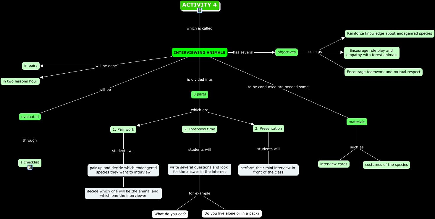 Este Cmap, tiene información relacionada con: Activity 4, 1. Pair work students will decide which one will be the animal and which one the interviewer, evaluated through a checklist, ACTIVITY 4 which is called INTERVIEWING ANIMALS, 3 parts which are 2. Interview time, INTERVIEWING ANIMALS will be evaluated, 3 parts which are 1. Pair work, 3. Presentation students will perform their mini interview in front of the class, write several questions and look for the answer in the internet for example Do you live alone or in a pack?, INTERVIEWING ANIMALS has several objectives, materials such as costumes of the species, 2. Interview time students will write several questions and look for the answer in the internet, INTERVIEWING ANIMALS will be done in two lessons hour, objectives such as Reinforce knowledge about endagenred species, INTERVIEWING ANIMALS to be conducted are needed some materials, INTERVIEWING ANIMALS will be done in pairs, INTERVIEWING ANIMALS is divided into 3 parts, write several questions and look for the answer in the internet for example What do you eat?, 1. Pair work students will pair up and decide which endangered species they want to interview, objectives such as Encourage teamwork and mutual respect, materials such as interview cards