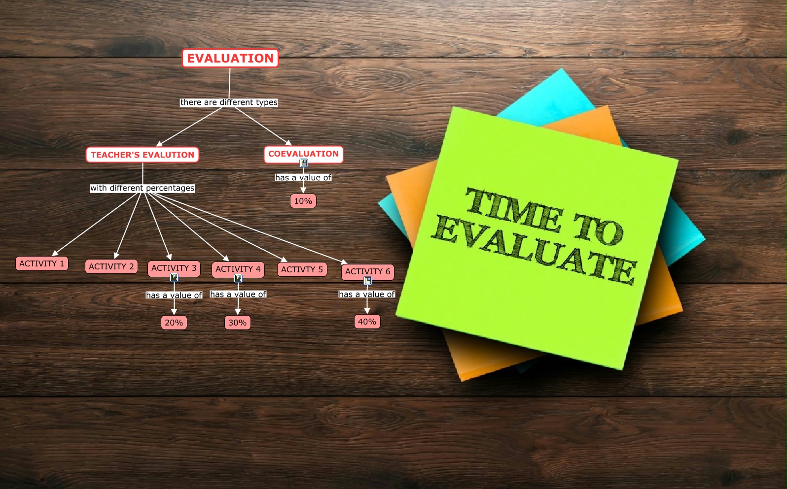 Este Cmap, tiene información relacionada con: EVALUATION, ACTIVITY 6 has a value of 40%, COEVALUATION has a value of 10%, ACTIVITY 3 has a value of 20%, TEACHER'S EVALUTION with different percentages ACTIVTY 5, TEACHER'S EVALUTION with different percentages ACTIVITY 3, TEACHER'S EVALUTION with different percentages ACTIVITY 1, TEACHER'S EVALUTION with different percentages ACTIVITY 2, EVALUATION there are different types COEVALUATION, ACTIVITY 4 has a value of 30%, EVALUATION there are different types TEACHER'S EVALUTION, TEACHER'S EVALUTION with different percentages ACTIVITY 6, TEACHER'S EVALUTION with different percentages ACTIVITY 4