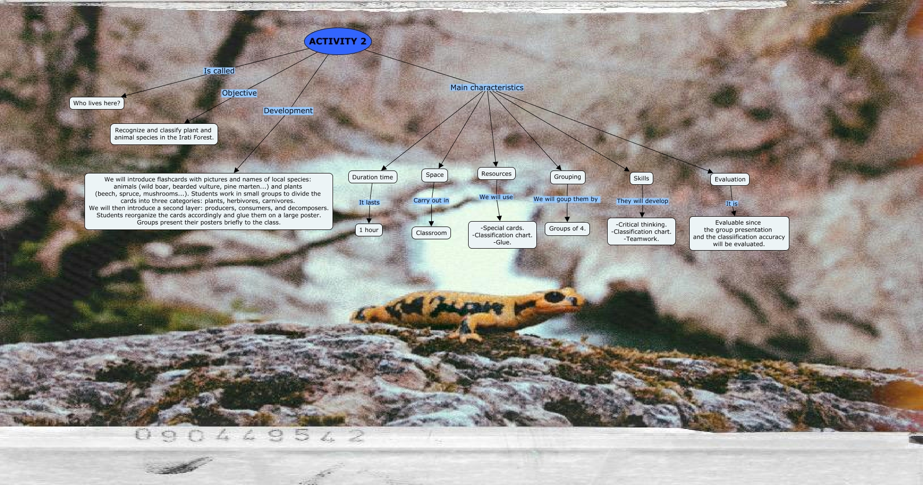 Este Cmap, tiene información relacionada con: Activity 2, ACTIVITY 2 Main characteristics Duration time, Duration time It lasts 1 hour, ACTIVITY 2 Is called Who lives here?, ACTIVITY 2 Main characteristics Evaluation, ACTIVITY 2 Main characteristics Grouping, Space Carry out in Classroom, Grouping We will goup them by Groups of 4., Resources We will use -Special cards. -Classification chart. -Glue., ACTIVITY 2 Main characteristics Resources, Evaluation It is Evaluable since the group presentation and the classiification accuracy will be evaluated., ACTIVITY 2 Main characteristics Skills, ACTIVITY 2 Objective Recognize and classify plant and animal species in the Irati Forest., ACTIVITY 2 Development We will introduce flashcards with pictures and names of local species: animals (wild boar, bearded vulture, pine marten...) and plants (beech, spruce, mushrooms...). Students work in small groups to divide the cards into three categories: plants, herbivores, carnivores. We will then introduce a second layer: producers, consumers, and decomposers. Students reorganize the cards accordingly and glue them on a large poster. Groups present their posters briefly to the class., Skills They will develop -Critical thinking. -Classification chart. -Teamwork., ACTIVITY 2 Main characteristics Space