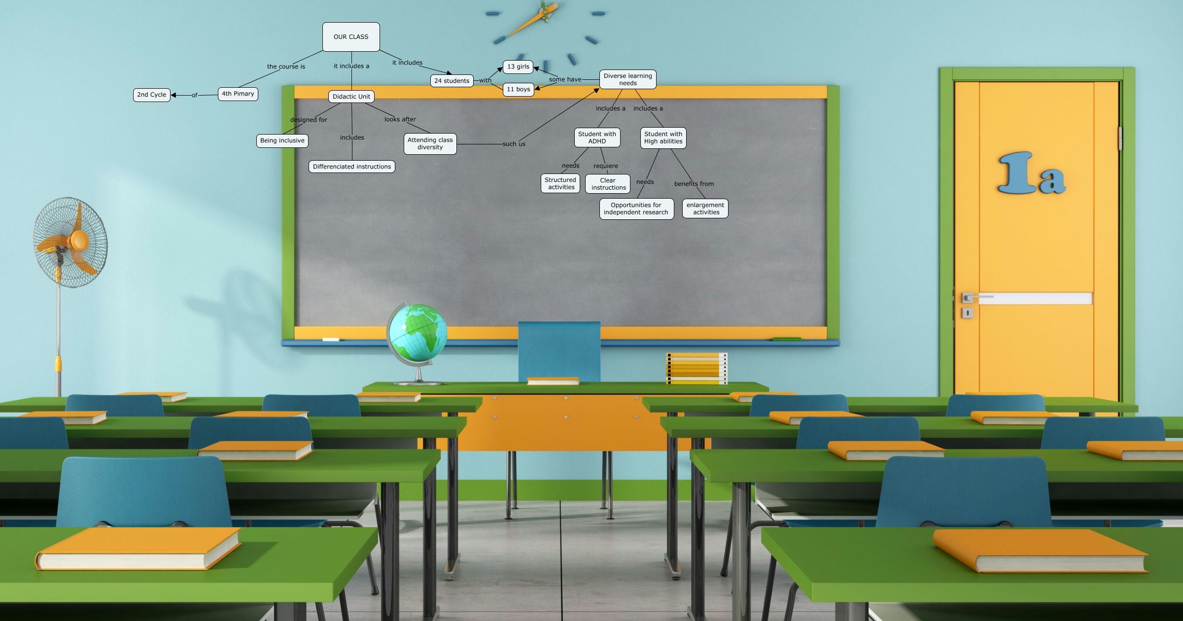 Este Cmap, tiene información relacionada con: Our class, Diverse learning needs some have 13 girls, OUR CLASS the course is 4th Pimary, Student with ADHD requiere Clear instructions, Didactic Unit looks after Attending class diversity, OUR CLASS it includes 24 students, Didactic Unit includes Differenciated instructions, Diverse learning needs includes a Student with ADHD, Diverse learning needs some have 11 boys, Student with High abilities needs Opportunities for independent research, Student with ADHD needs Structured activities, Diverse learning needs includes a Student with High abilities, Student with High abilities benefits from enlargement activities, OUR CLASS it includes a Didactic Unit, 24 students with 13 girls, 24 students with 11 boys, Attending class diversity such us Diverse learning needs, Didactic Unit designed for Being inclusive, 4th Pimary of 2nd Cycle