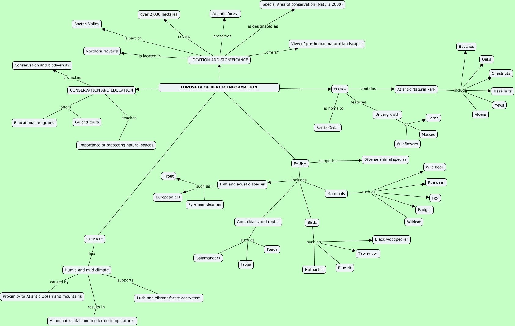 Este Cmap, tiene información relacionada con: Place information, Birds such as Blue tit, Mammals such as Wild boar, Mammals such as Roe deer, LORDSHIP OF BERTIZ INFORMATION CONSERVATION AND EDUCATION, FAUNA includes Fish and aquatic species, Mammals such as Badger, LORDSHIP OF BERTIZ INFORMATION LOCATION AND SIGNIFICANCE, FAUNA supports Diverse animal species, Amphibians and reptils such as Toads, Atlantic Natural Park include Yews, Undergrowth of Ferns, LOCATION AND SIGNIFICANCE preserves Atlantic forest, Amphibians and reptils such as Frogs, Atlantic Natural Park include Oaks, Fish and aquatic species such as Pyrenean desman, CONSERVATION AND EDUCATION offers Educational programs, Amphibians and reptils such as Salamanders, LOCATION AND SIGNIFICANCE offers View of pre-human natural landscapes, CONSERVATION AND EDUCATION promotes Conservation and biodiversity, LOCATION AND SIGNIFICANCE is located in Northern Navarra
