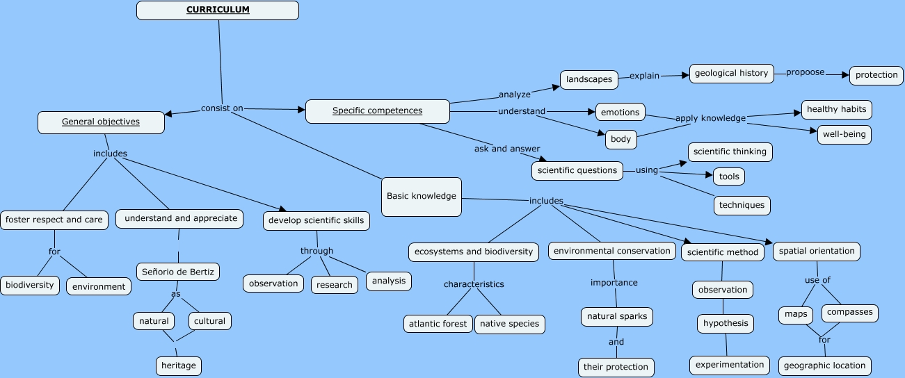 Este Cmap, tiene información relacionada con: Objectives, scientific questions using scientific thinking, landscapes explain geological history, ecosystems and biodiversity characteristics atlantic forest, natural heritage, Specific competences ask and answer scientific questions, emotions apply knowledge well-being, emotions apply knowledge healthy habits, Basic knowledge includes scientific method, ecosystems and biodiversity characteristics native species, CURRICULUM consist on General objectives, Basic knowledge includes ecosystems and biodiversity, Señorio de Bertiz as natural, scientific questions using tools, body apply knowledge well-being, Specific competences analyze landscapes, natural sparks and their protection, CURRICULUM consist on Basic knowledge, cultural heritage, body apply knowledge healthy habits, develop scientific skills through research