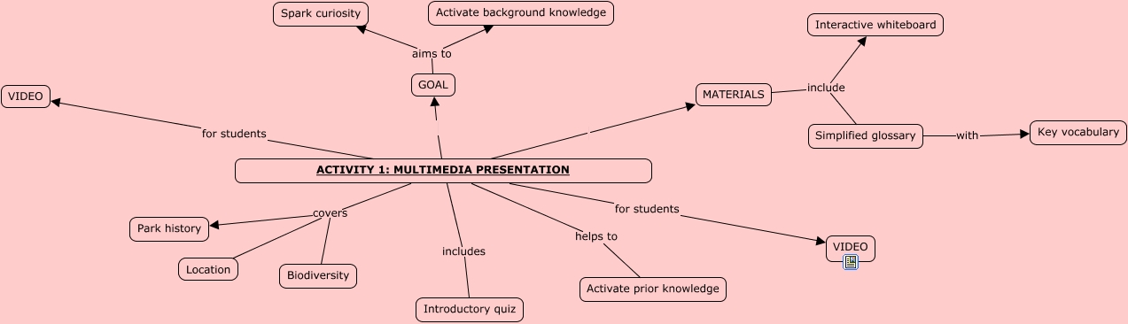 Este Cmap, tiene información relacionada con: Activity 1, MATERIALS include Interactive whiteboard, ACTIVITY 1: MULTIMEDIA PRESENTATION MATERIALS, ACTIVITY 1: MULTIMEDIA PRESENTATION for students VIDEO, GOAL aims to Spark curiosity, ACTIVITY 1: MULTIMEDIA PRESENTATION covers Location, ACTIVITY 1: MULTIMEDIA PRESENTATION for students VIDEO, MATERIALS include Simplified glossary, ACTIVITY 1: MULTIMEDIA PRESENTATION GOAL, ACTIVITY 1: MULTIMEDIA PRESENTATION covers Park history, Simplified glossary with Key vocabulary, ACTIVITY 1: MULTIMEDIA PRESENTATION helps to Activate prior knowledge, ACTIVITY 1: MULTIMEDIA PRESENTATION covers Biodiversity, ACTIVITY 1: MULTIMEDIA PRESENTATION includes Introductory quiz, GOAL aims to Activate background knowledge